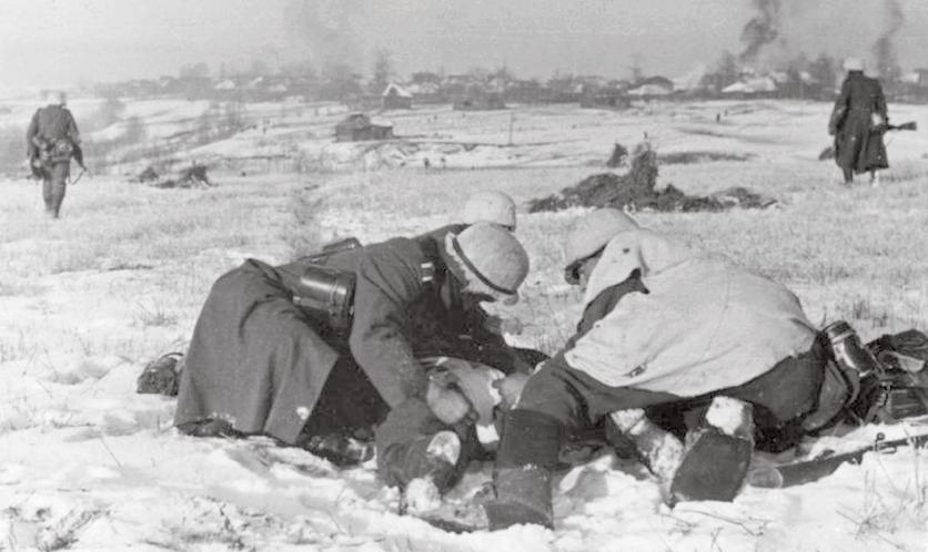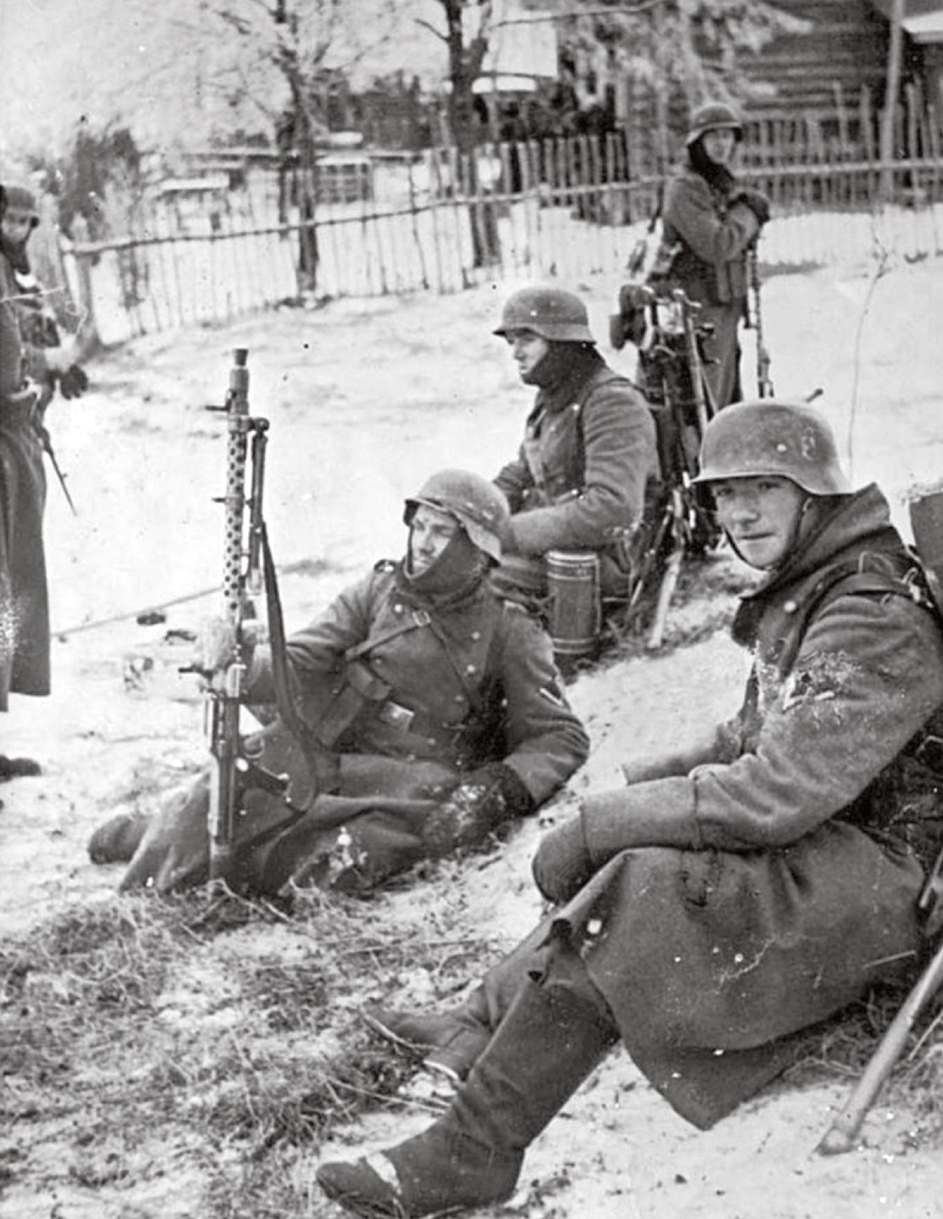 Pěší družstvo odpočívá během postupu na Moskvu. Dne 15. listopadu 1941 konečně zamrzla půda, čímž se vyřešil problém s blátem, ale vyskytly se nové potíže.