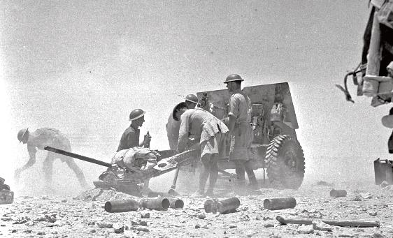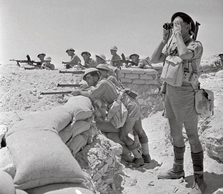 Britská pěchota v postavení u El Alameinu – první bitva v tomto sektoru pomohla zastavit nápor nepřátel a stabilizovat situaci po katastrofě u Gazaly a Tobruku.