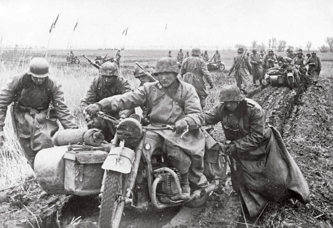 Dny blitzkriegu skončily. Zde musejí motocyklisté z průzkumného praporu táhnout své stroje přes podmáčené pole.