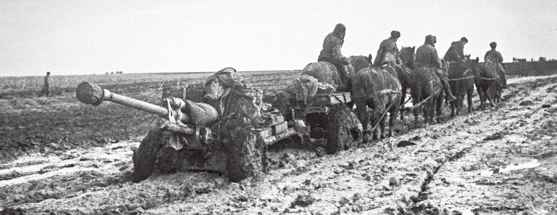 Sověti táhnou bahnem polní dělo ráže 76 mm. Rudou armádu počasí také ovlivňovalo, ale byla podstatně lépe připravena. S Moskvou v zádech těžila z krátkých zásobovacích linií, zatímco ty nepřátelské se neúnosně natahovaly. Německé lokomotivy se v ruském podnebí rychle opotřebovávaly a voda v jejich kotlích zamrzala. Navíc zaostávaly tažnou silou a ve výsledku jednotkám Wehrmachtu například často chyběla dělostřelecká munice.