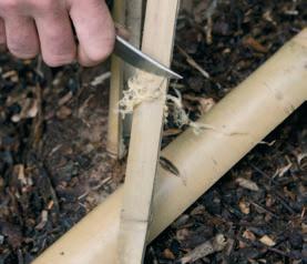 Mačetou odsekněte zhruba metrový kus bambusu o průměru 8–10 cm. Celý kus podélně rozpulte a jednu z polovin ještě ořezejte do tenka. Jeden konec této „pily“ opřete o pevně ukotvený kámen na zemi, druhý o plochý kus dřeva, který si zapřete o břicho. Tak „pilu“ udržíte ve svislé pozici, i když se o ni budete opírat. Ostrý konec by měl směřovat od vás. Právě jste si vyrobili statickou část „pily“.