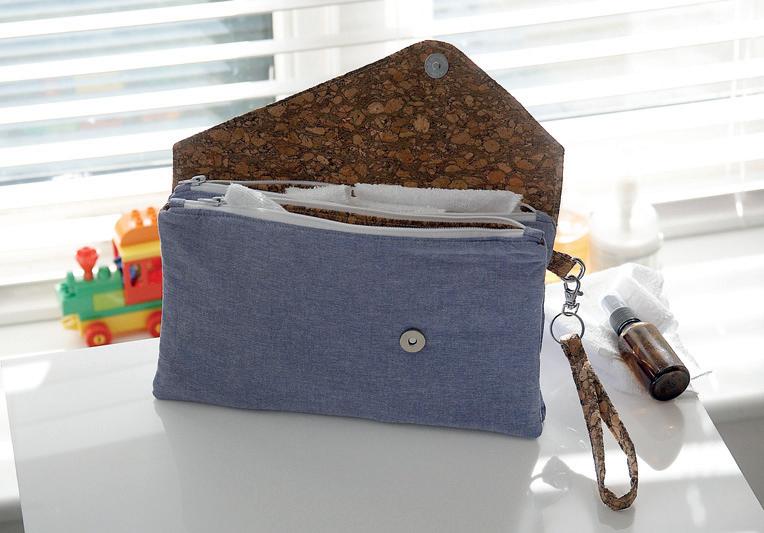 2 Dvě části kapes sešijte lícovými stranami k sobě a na dolní straně ponechte otvor na obrácení široký 5 cm. Obstřihněte rožky, obraťte lícovou stranou ven a přežehlete. Odměřte si 5 cm od jednoho z horních rohů, protilehlý roh přehněte dovnitř k tomuto bodu a přežehlete. Totéž zopakujte s druhou kapsou, která by měla být zrcadlovým obrazem té první.