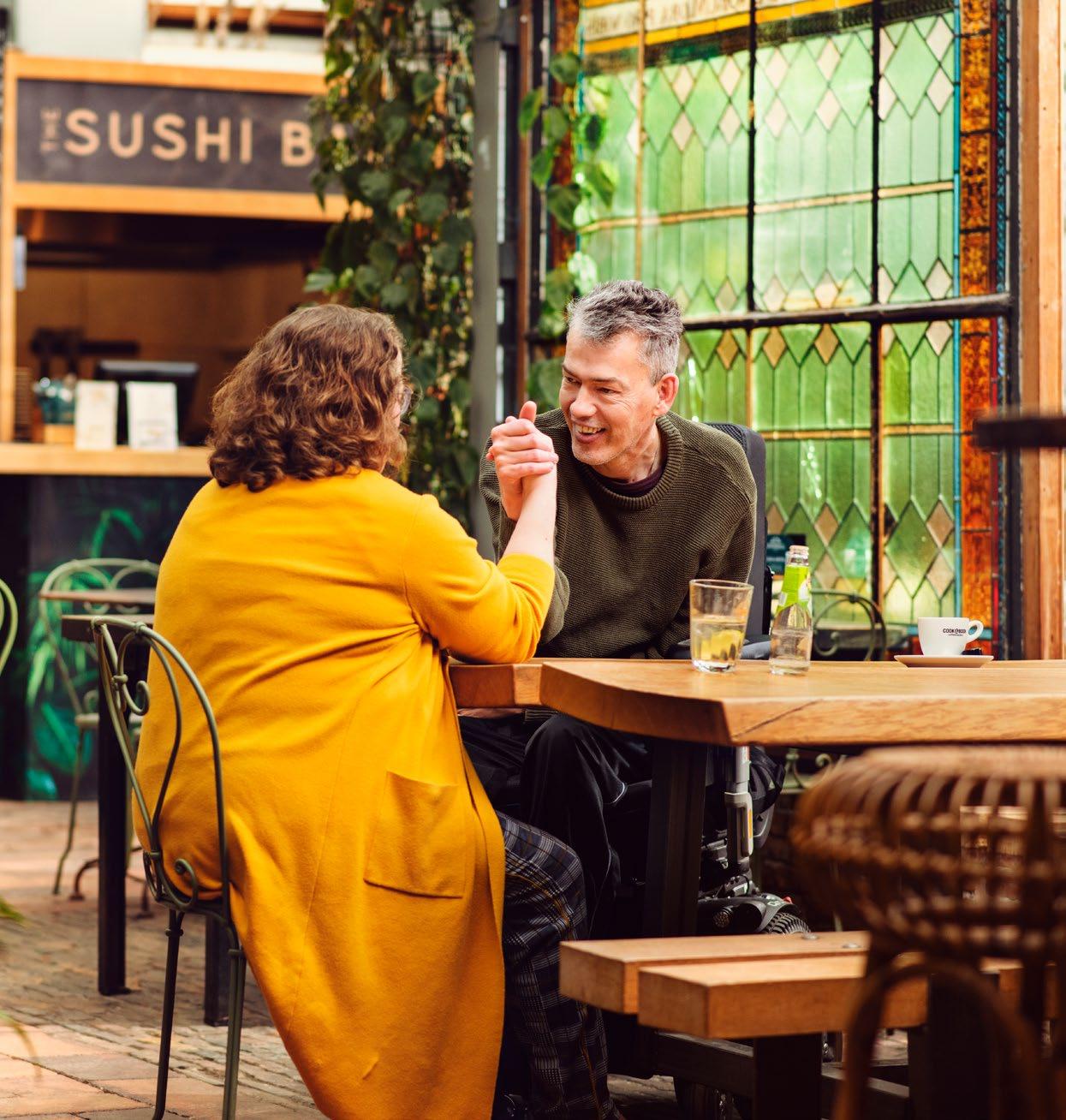 Als Danny naar MPS de Zonnebloem gaat, komt hij er altijd langs. Maar hij had geen idee dat de Foodhall zo fotogeniek was. “Leuk om hier met Wilma even heerlijk te babbelen!” Ze werden vrienden na hun ontmoeting via de Zonnebloem en hebben nog iedere dag contact, terwijl ze honderd kilometer uit elkaar wonen. “Als ik iemand mag, mag ik hem voor altijd”, is Wilma’s antwoord wanneer mensen er verbaasd naar vragen.