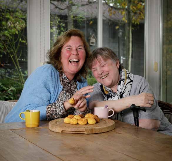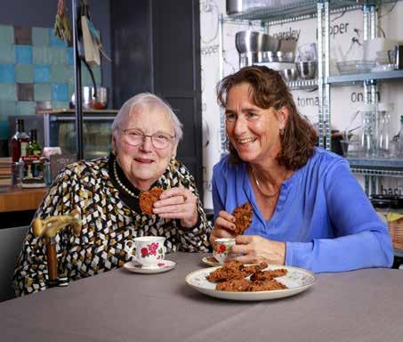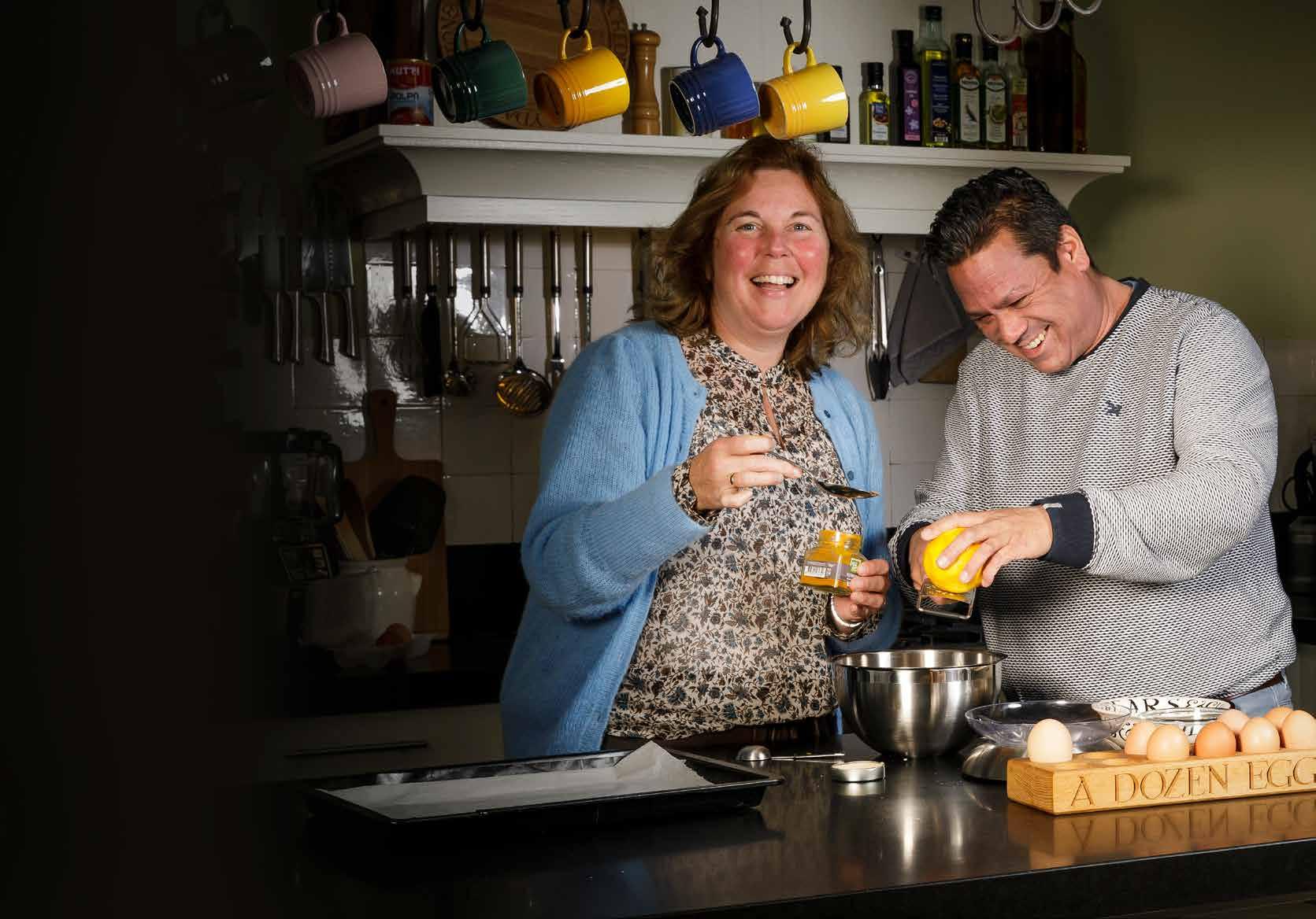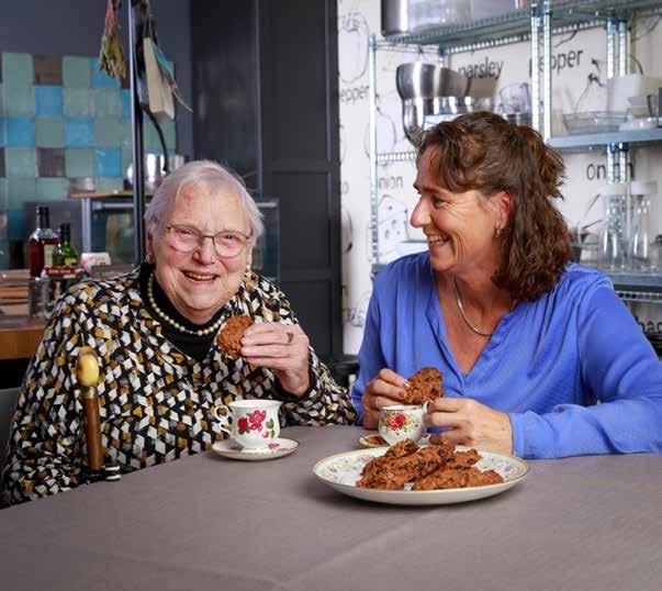 “Thuis zeiden ze: ‘dat wordt niks jij en bakken’, want ik ben niet zo’n keukenprinses, maar het was erg leuk om te doen”, vertelt Lenny Wondergem, bezoekvrijwilliger en secretaris van de afdeling Strijen. Samen met Marjolein Poel, oud-Zonnebloemmedewerker en tegenwoordig eigenaar van kookstudio Dames de Jong in Mijnsheerenland, bakte ze “superlekkere havermoutkoeken met rozijnen” voor deelnemer Teuntje Andeweg. “Teuntje is altijd overal voor in, want ze kan niet gemakkelijk van huis. Ze heeft genoten. Met al die flitslampen en aandacht voelde ze zich een koningin. Misschien doen we het samen nog eens dunnetjes over. Zoiets kleinschaligs bij iemand thuis past helemaal in deze tijd.”