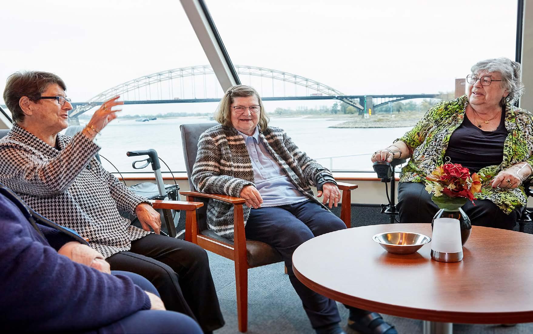 “Wat fijn om elkaar weer te kunnen omhelzen”, begint Diny, de jongste van de Bekker zussen. Zus Nel knikt instemmend: “We gaan sinds 2009 met het schip mee. Omdat we allemaal slecht ter been zijn, is dit voor ons de enige manier om op vakantie te kunnen. We wonen ver uit elkaar, zelfs op verjaardagen zien we elkaar niet. We bellen en appen wel veel, maar elkaar echt in de ogen kunnen kijken en aanraken, is onvervangbaar.”