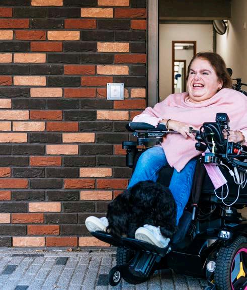 “Poeh, heb je even?”, lacht Annemarie als je vraagt wat haar bezighoudt op een ge middelde dag. “Ik ben tegen wil en dank eigen baas, omdat ik veel zorg nodig heb vanwege mijn spierziekte. En dat regel ik allemaal zelf.” Plannen kan ze daardoor als de beste. “Maar”, verzucht ze, “spontani teit loop ik mis.” En hondje Pip met haar gekke fratsen dan? Breed lachend: “Zij brengt het spontane in mijn leven en laat mij iedere dag stralen.”
