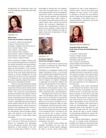 Lt. Governor: Adriana Otero Treasurer: Anabell Aostalli Secretaries: Aída Domínguez and Ana María López de Neil Area 1 Directors: Alicia Barrios, Liliana Hidalgo and Ana Medina Area 2 Directors: Graciela Duce and Cecilia Vega Jacqueline holds a degree in surgical instrumentation and works in a private clinic, where she organizes surgeries. She enjoys working as a member of a team. Her extensive interaction with members of the community also allows her to share her knowledge of Zonta and raise awareness of the organization in the community. Jacqueline joined Zonta International in 2007 because she wanted to improve the situation of women living realities very different from her own. Five years later, she loves being a member of Zonta and is proud that she has helped to increase the membership of her club. She served as lt. governor of Region South America, prior to being elected region representative for the 2012-2014 Biennium. As a member of the Zonta Club of Punta del Este-Maldonado, Jacqueline is especially proud of the Wig Bank her club sponsors, through which the Club provides free, natural hair wigs to women undergoing chemotherapy treatment for cancer, who would otherwise not be able to afford the expensive wigs. As regional representative, Jacqueline will work to increase Zonta International’s credibility and visibility by raising awareness of Zonta in the community, especially in professions where women are leaders. Continued on page 58... 2012–2014 Biennium issue one