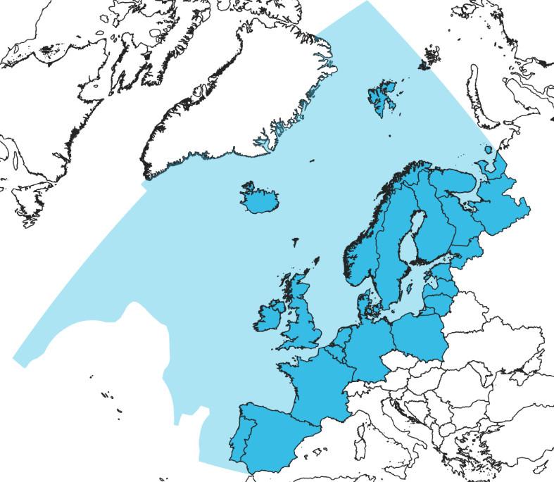 Theareacoveredbythisreport(shadedinblue) basedontheOSPARregionofthenorthAtlantic.