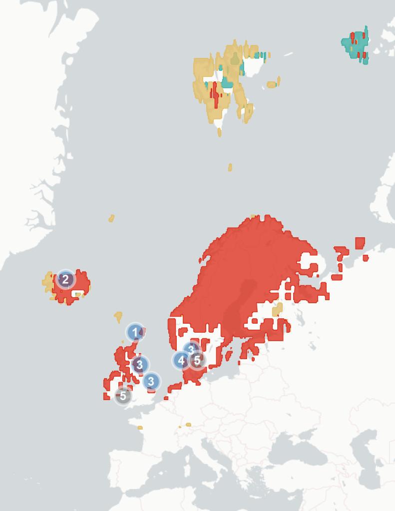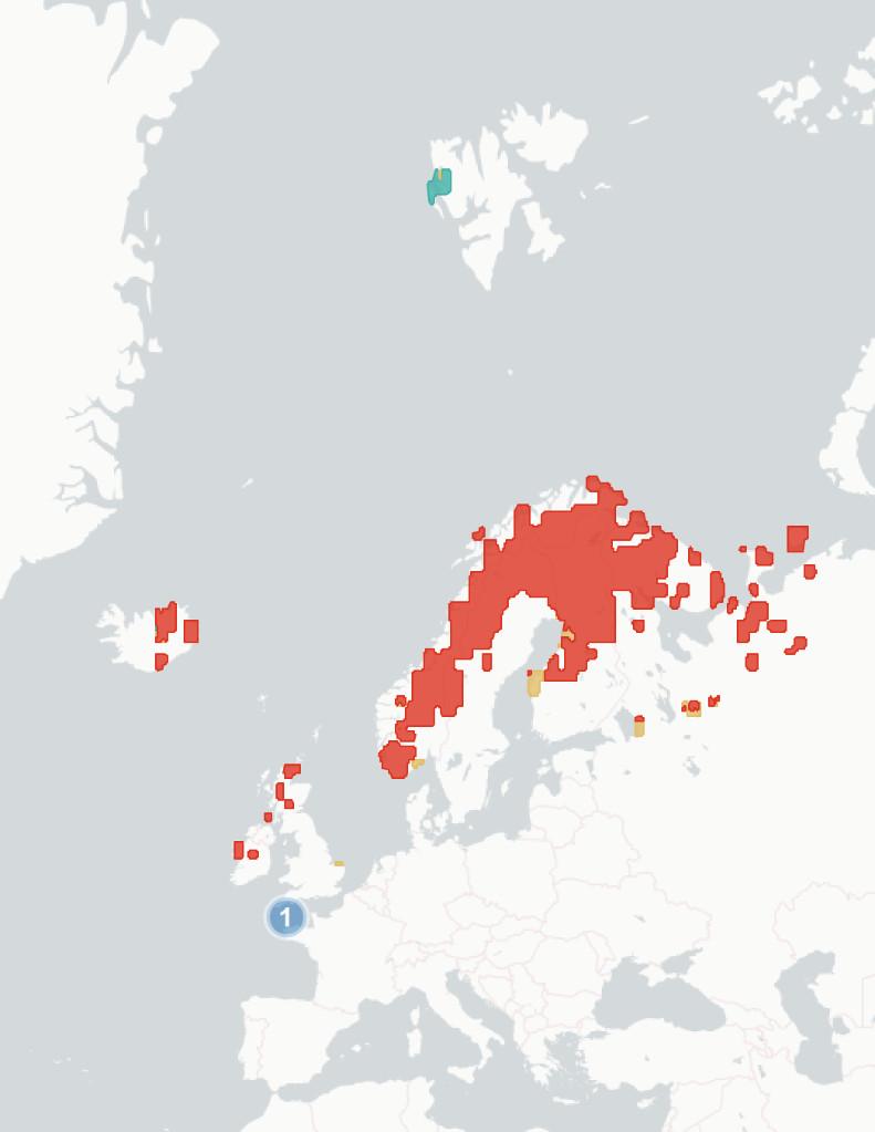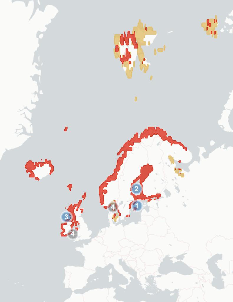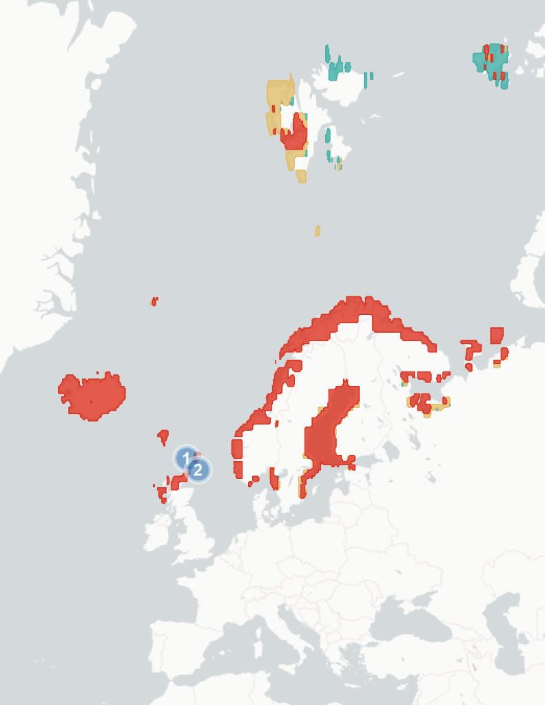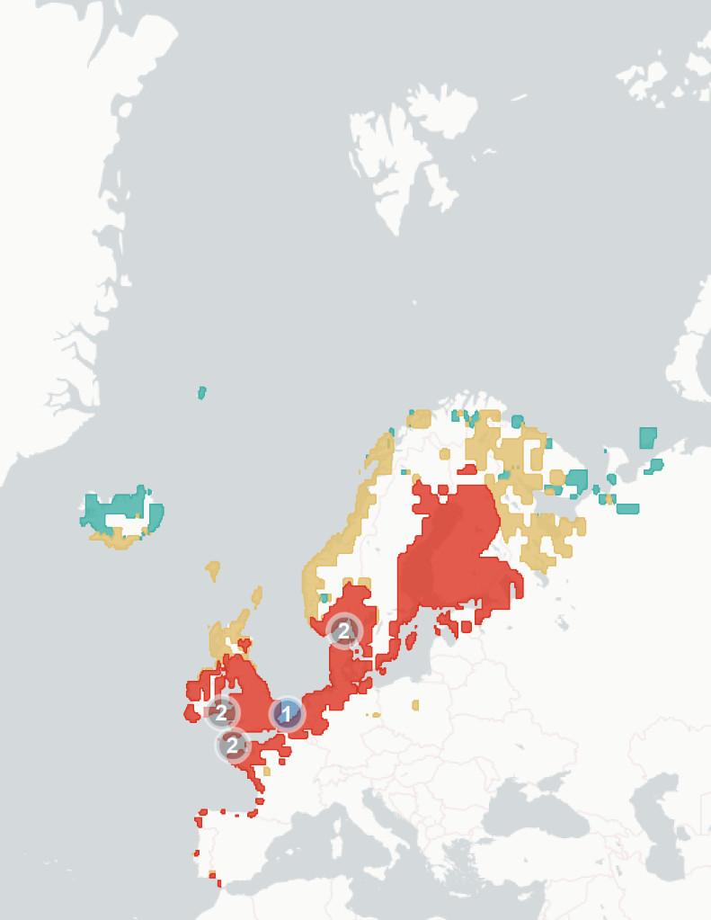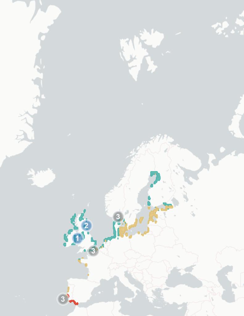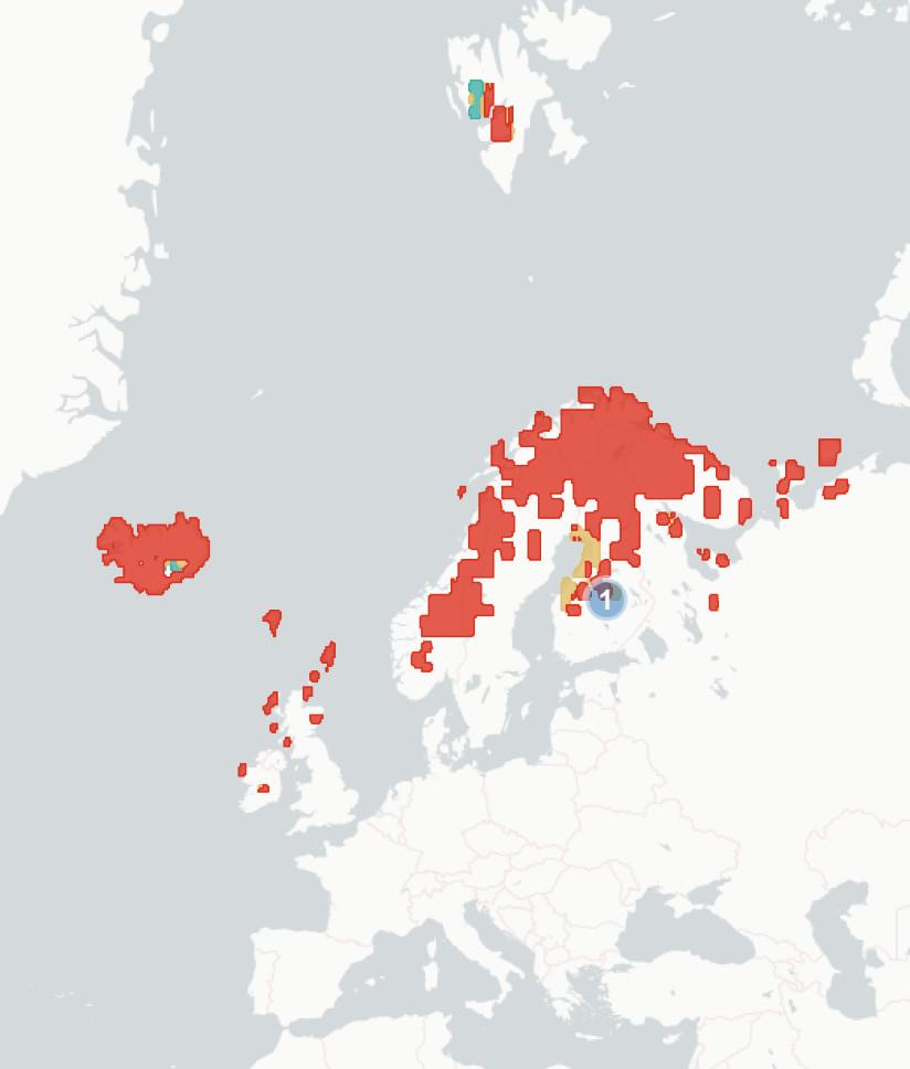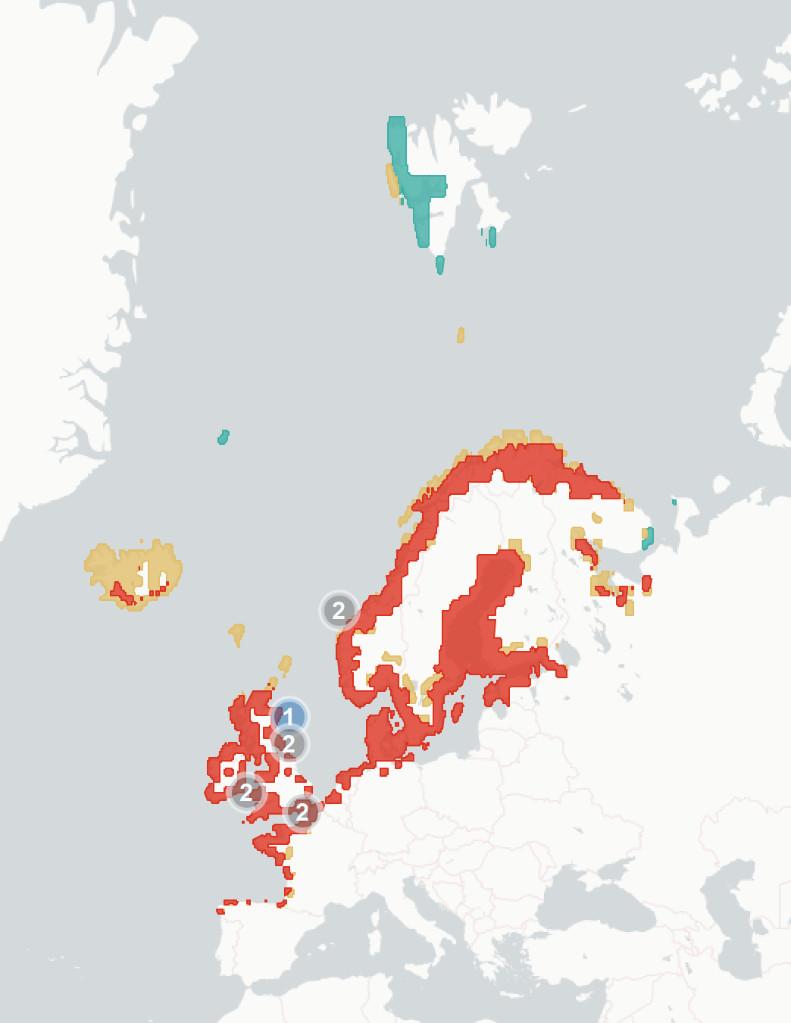 ◦Section1.1.2Potentialchangesinbreedinghabitatsuitability. Wehere aimtopredicthowmuchofthespecies’currentbreedingrangewillbe significantlylesssuitablein2070-2100,baseduponchangestothemarineand terrestrialenvironment.Wealsoestimatewhatproportionislikelytoremain suitable,andwhetherpartsofspecies’currentrangeswillbecomemore suitable.Theunderlyingspeciesdistributionmodel(SDM)considerspredicted changesintemperature,precipitation,salinity,distancefromtheseaand marinechlorophyllconcentration,aswellasseveralspecies-specificvariables whicharedetailedintheappendices.Aftercomparingestimatedhabitat suitabilitybetween2020and2070-2100,wesplitthecoastalregionofNorthWestEuropeintooneofthefourfollowingcategories:1)Habitatiscurrently suitableforagivenspeciesbutwilllikelybecomesignificantlylesssointhe future(markedinredonthemap),2)Habitatiscurrentlysuitableandwilllikely remainstableinthefuture(markedorangeonthemap),3)Habitatiscurrently suitablebutwillbecomesignificantlymoresointhefuture(markedgreenon themap)and4)Habitatisnotcurrentlysuitableandwillnotbeinthefuture (notmarkedonthemap).Thereisconsiderableuncertaintyaroundthese estimates,andassuchtheyshouldbeunderstoodasanindicatorofriskrather thanafirmprediction.Notethatmapsareaggregatedandenlargedtomake smallislandsmorevisibleandarenotexactrepresentationsofspeciesranges.