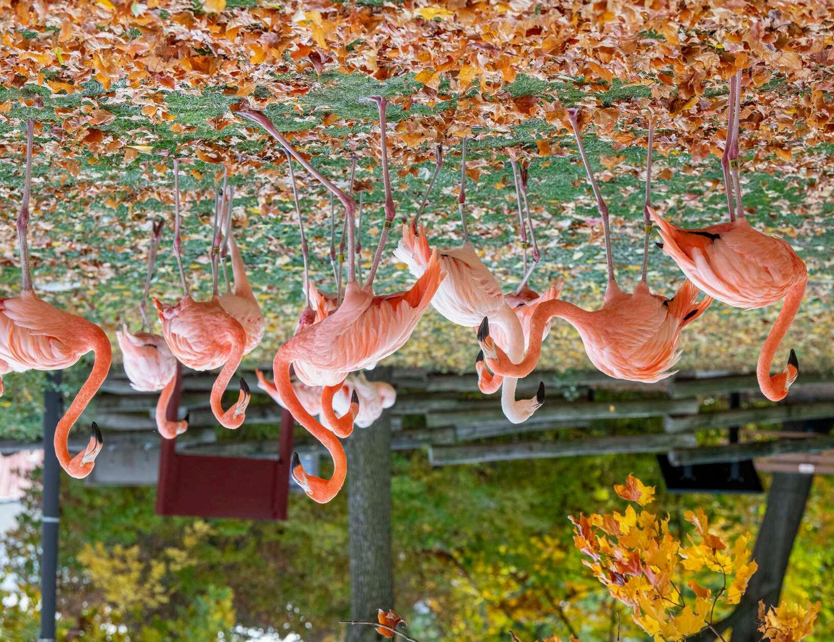 Amid the fall foliage, the Chilean and Caribbean flamingo flamboyance brings a splash of pink to the season! Caribbean flamingos sport bright pink plumage, while the smaller Chilean flamingos have pale pink feathers.