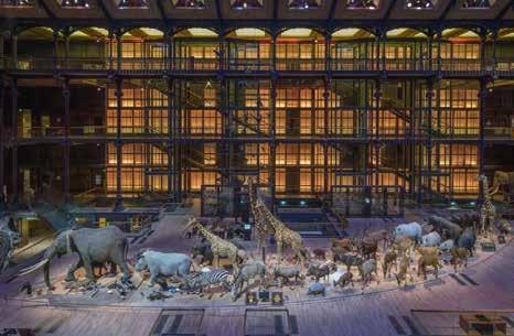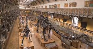 Galerie de Paléontologie et d’Anatomie comparée 1898年開館。恐竜、哺乳類、無脊椎動物の化石、地球上の植物標本 などが自然界の歴史の変遷をたどれるように展示されている。全長80 メートルの大ホールにならぶ約4300種もの骨格標本が来館者を迎える。 大窓から差し込む自然光に照らされた数々の大型骨格標本たちの光景は 実に壮観だ。なかでも、1768年に絶滅したステラーカイギュウや1961 年に絶滅したフクロオオカミ、シーラカンス、ルイ14世の象、ルイ15世 のサイなどは見逃せない。続く古生物学フロアには316体の完全な骨格 をふくむ、実に2000点以上の化石が展示されている。さらにバルコニー にも5000点以上の化石が並ぶ。(現在は閉館中)。