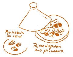 干しプルーンpruneauxは、南西部、 ガロンヌ川に沿った町アジャンを中心 に栽培されている。その甘酸っぱい風 味は、ウサギ、豚、七面鳥などの肉 と相性がよいし、モロッコでは、子羊 の肉といっしょに煮込んでタジン(蒸し 煮)にする。料理につかうときは、薄 めの紅茶に数時間ひたしてからの方が ふっくらとしておいしくなる。デザート としては、プディングや今回のファー ルに欠かせないし、フルーツサラダに 入れたり、アーモンドのあんこpâte d’amandesをはさめば、可愛いつま み菓子になる。パーティーではベーコ ンで巻いてオーブンで焼いたものがよ く出てくる。