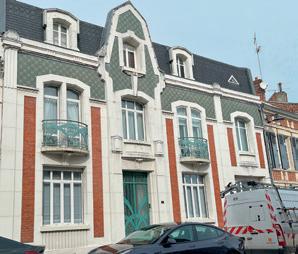 Rue de la Sous préfecture 19-20番地(写真上)にはサン・カンタン市議会場 を手がけた建築家ルイ・ガンデーズによる暖房器 具店と上階に住居。アール・デコに典型的なボー ウィンドー(出窓)と花かごのモチーフに加え、三 角の段々になった切妻で地方色を加えている。11 と33番地はジュール・アルデュアン設計(下写真は 33番地)。ファサード上部にモザイクとエドガール・ ブラントが考案した「オアシス」と呼ばれる模様の 鉄柵。11番地は刺繍用品店(1923年)だった。手 すりにもファサードにも花にあふれている。