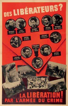 彼らレジスタンスのグループは「赤いポス ター」(画像)とともに今日まで語り継がれて きた。これは44年2月にナチスが作ったもの で、1万5千枚がフランス主要都市に掲げられ た。ナチスは「これら外国人、共産主義者、 ユダヤ人は〈犯罪者集団〉であり、”フランス 解放者”ではない」というネガティブ・キャン ペーン。しかし逆に、このポスターは彼らを 外国人レジスタンスの英雄にした。