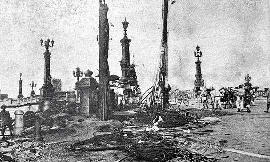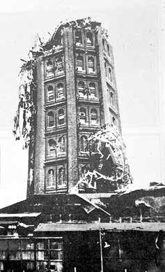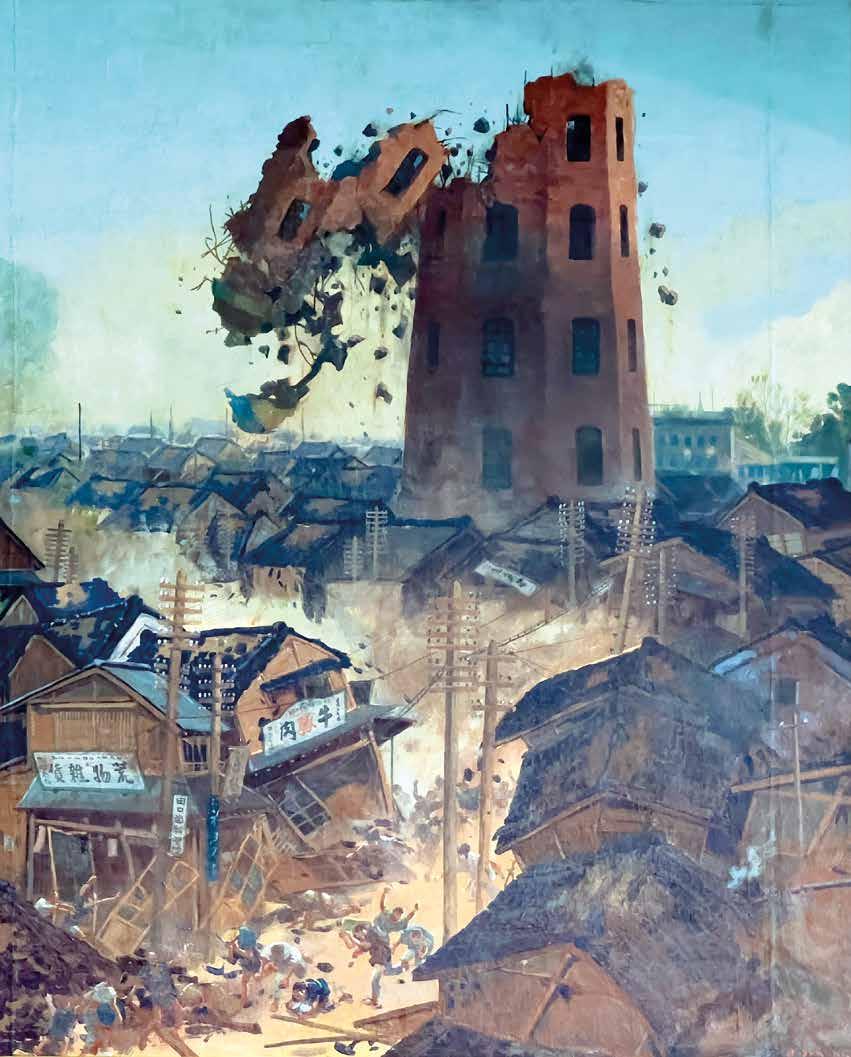 gratte-ciel de style occidental de 68,58 mètres de haut qui était à l’époque l’attraction la plus populaire de la capitale. L’Asakusa Jûnikai (Asakusa de 12 étages), comme on l’appelait affectueusement, avait été construit en 1890 dans le quartier d’Asakusa et abritait le premier ascenseur électrique du pays et 46 boutiques vendant les dernières merveilles technologiques du monde entier. Le tremblement de terre a détruit les étages supérieurs et endommagé la tour de manière considérable, si bien qu’elle a dû être démolie le 23 septembre.