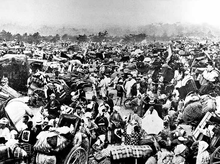 Le 1er septembre 1923, à 11h58, un tremblement de terre de magnitude 7,9 sur l’échelle ouverte de Richter secoue la région du Kantô, qui englobe Tôkyô et les préfectures environnantes, notamment Kanagawa, Saitama et Chiba. Au total, 114 secousses ont été ressenties ce jour-là. Rien que dans la capitale, 187 incendies majeurs se sont déclarés, enveloppant rapidement la métropole de flammes et réduisant en cendres les habitations, les installations industrielles et les infrastructures publiques. Une estimation récente porte le nombre de morts et de disparus à 105 000. Lorsqu’une catastrophe d’une telle ampleur se produit, la cause principale des décès varie en fonction de plusieurs facteurs. Lors du séisme de Hanshin qui a frappé la région d’Ôsaka-Kôbe en 1995, par exemple, de nombreuses personnes
