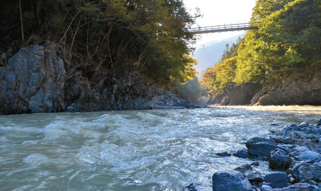 d metres from the campsite, we take a small path along the Hikawa valley connected by a suspen-