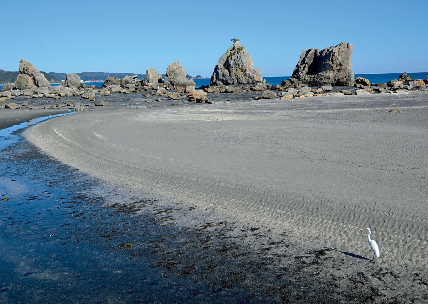 Following the coastline, you’ll soon reach Shirama (literally ‘the white beach’) bordering the wild sea, with its pure white sand (imported from Australia), contrasting with the numerous contemporary hotel developments, amusement parks and an aquarium situated on the outskirts of the city. The long crescent moon-shaped beach and translucent blue water make this a great place to stop and have a lovely, refreshing swim before continuing to explore this western coast. But be w a r n e d , t h i s , t h e p r e m i e r s e a s i d e r e s o r t i n t h e Kansai region, is very crowded at peak season in July and August and almost deserted the rest of the year