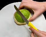 Ask an adult to help you cut an avocado in half. Remove the seed and skin, then carefully put the avocado half cut side down on top of the cream cheese toast. 3