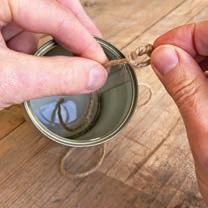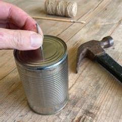 Get an adult to make a small hole in the bottom of each can by lightly tapping the nail through its centre using a hammer. Wiggle the nail to make a hole and then remove it.