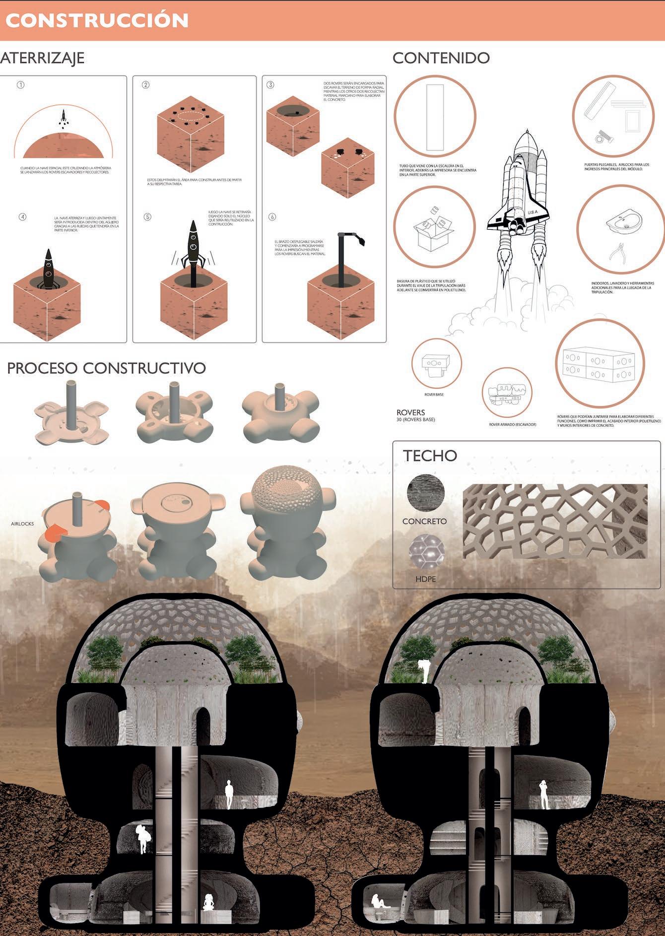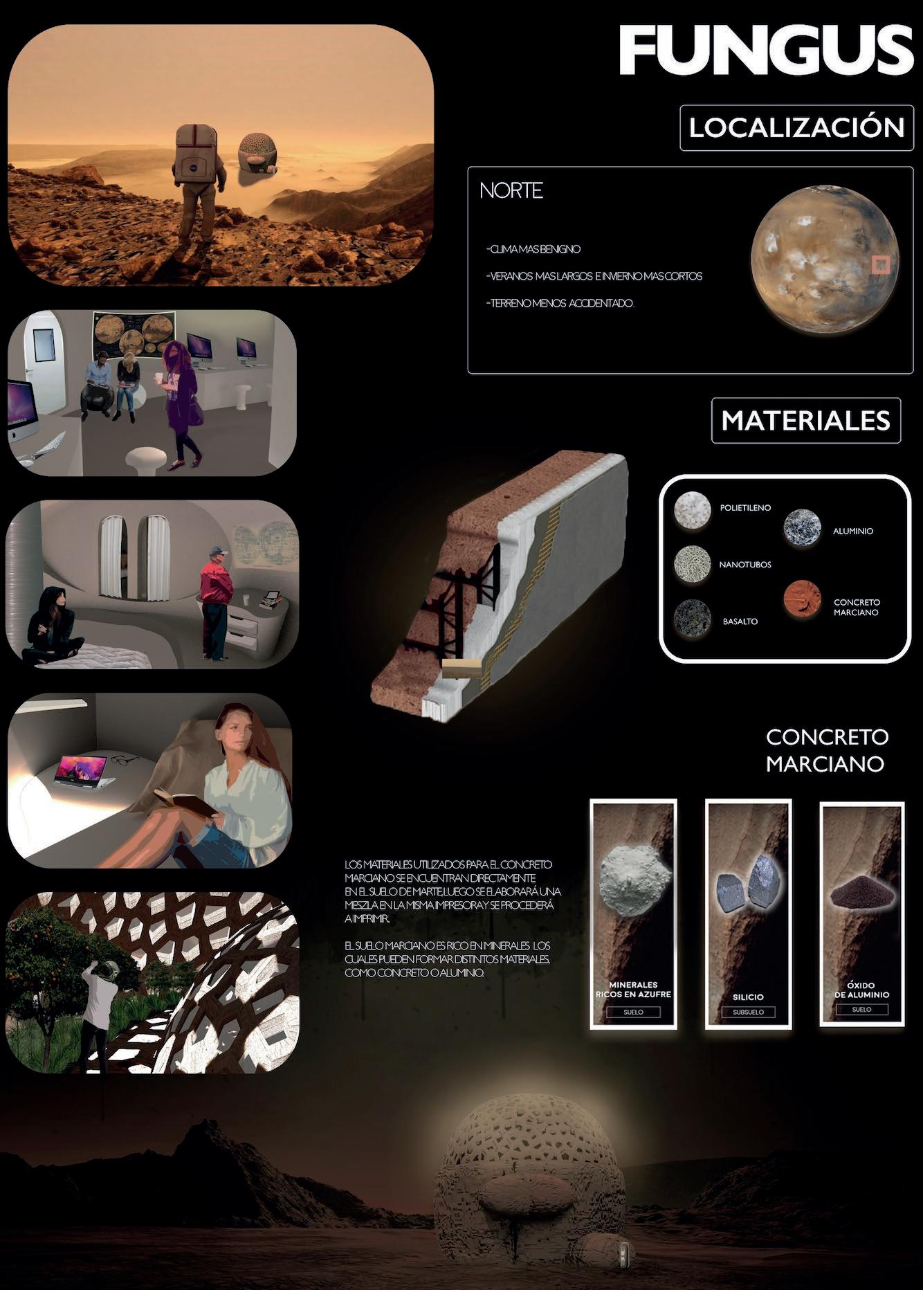DESCRIPTION: Fungus is a project based on Stephen Hawking’s premise “life in the future will be interplanetary”. Based on this and from a deep investigation about materials and 3D printing technology, it is proposed how architecture could join scientific disciplines to make this challenge possible, designing a refuge habitat built with volcanic stone from the planet Mars and that fulfills the necessary requirements for survival such as: radiation protection, sand storms, heat conservation and no angles because of atmospheric pressure.