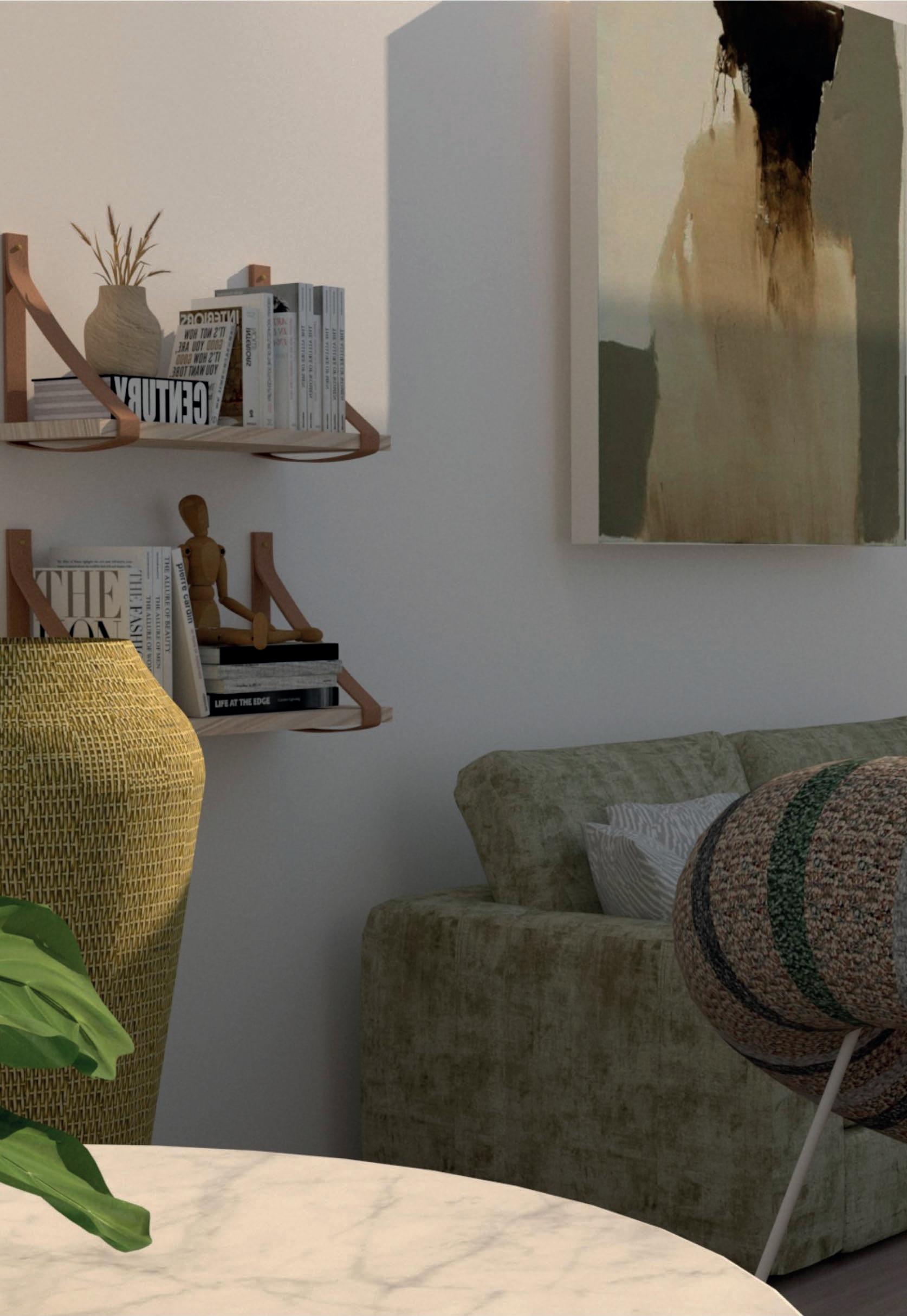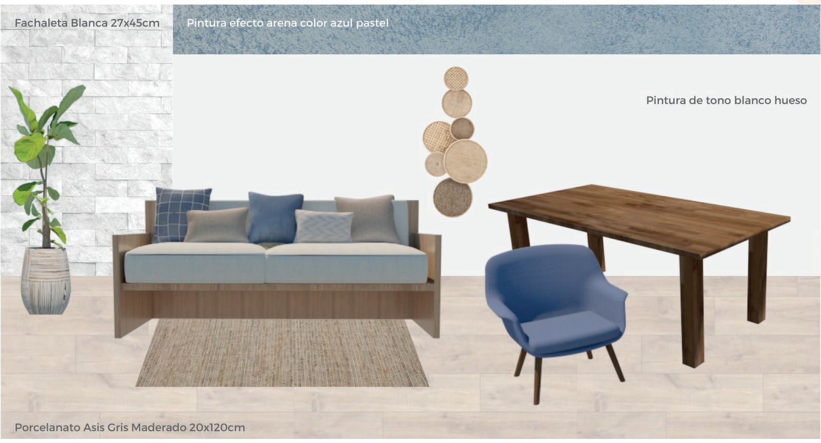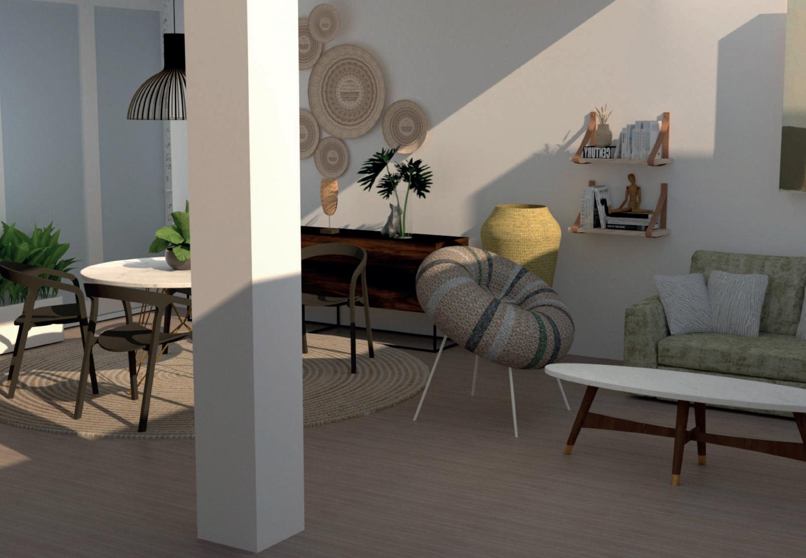 DESCRIPTION: Two-level house in which the BOHO CHIC trend is applied as the predominant one, through the decoration of wicker objects, wooden elements and warm or neutral tones, as well as the addition of vegetation, and the fineness of the furniture structure. The use of color on the wall and the floor also accompany the purity of gray or white tones.