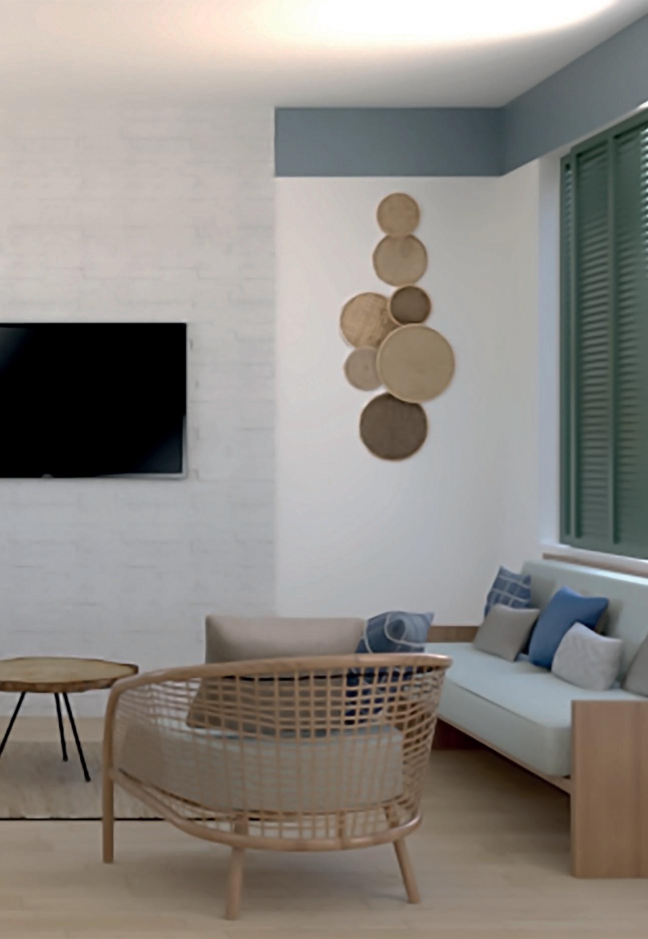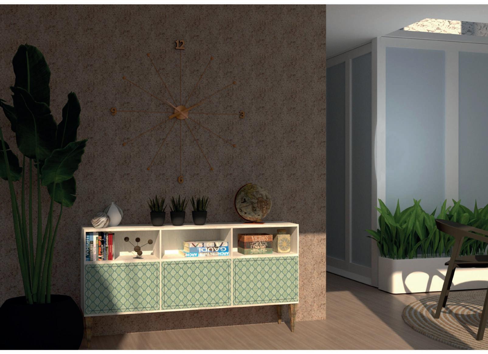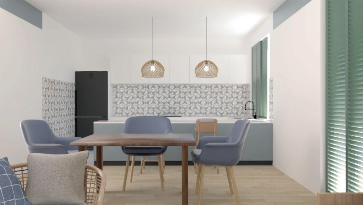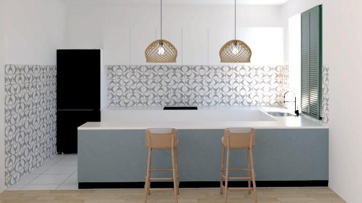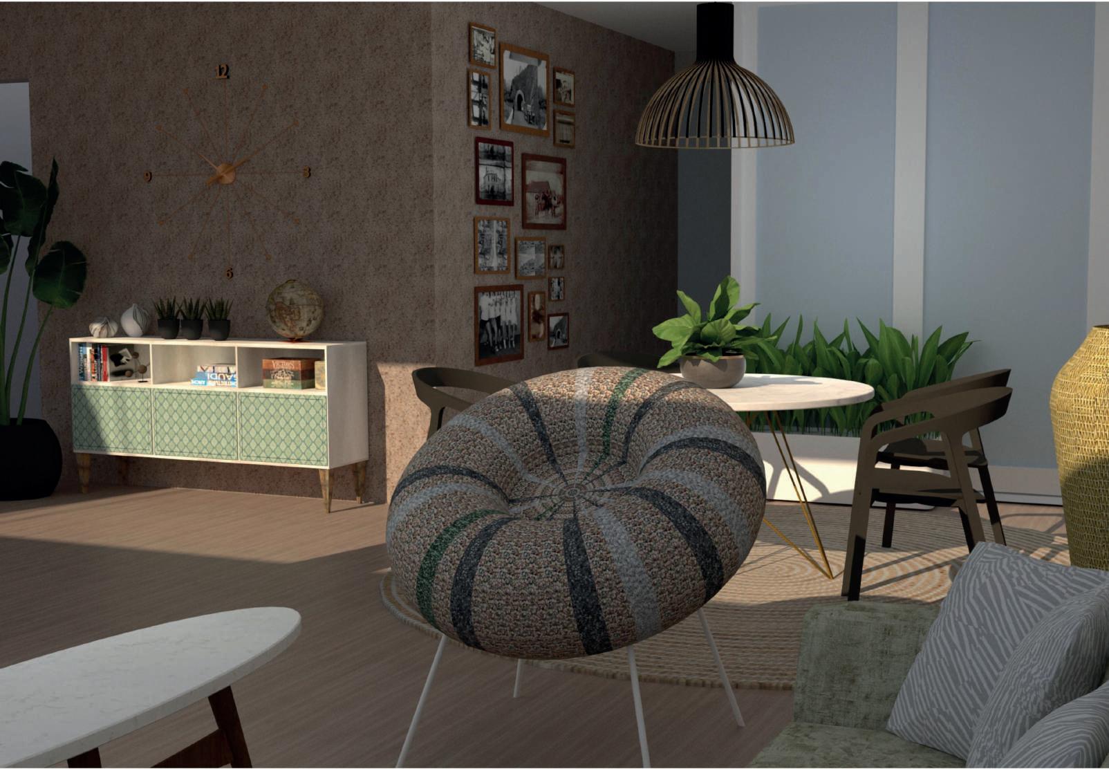 DESCRIPTION: Two-level house in which the BOHO CHIC trend is applied as the predominant one, through the decoration of wicker objects, wooden elements and warm or neutral tones, as well as the addition of vegetation, and the fineness of the furniture structure. The use of color on the wall and the floor also accompany the purity of gray or white tones.