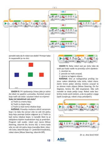 IZAZOV 8. Pri spašavanju žrtava jako je važno da robot ne upadne u provaliju. Koristeći senzor boje nađi rub stola i zaustavi robot na vrijeme! Kako ćeš detektirati rub stola? a) Tražit ću crvenu boju b) Tražit ću bijelu boju c) Tražit ću kad nema nikakve boje RJEŠENJE: Provaliju možemo otkriti senzorom boje i to tako što senzor više ne vidi niti jednu boju koju poznaje (točan odgovor je c) Tražit ću kad nema nikakve boje). U naredbi Wait to je obilježeno bijelim kvadratićem koji je prekrižen. Program radi ovako: robot vozi ravno (Move Steering, izbornik On, brzina 50). U trenu kada više ne vidi niti jednu boju (naredba Wait, izbornik Color, izbornik boje: 0 – prekriženi kvadratić), robot stane (Move Steering, izbornik Off).