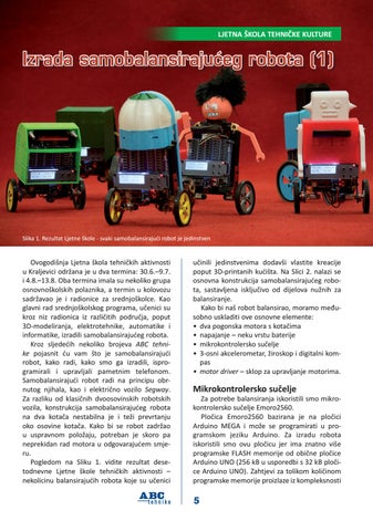 Ovogodišnja Ljetna škola tehničkih aktivnosti u Kraljevici održana je u dva termina: 30.6.–9.7. i 4.8.–13.8. Oba termina imala su nekoliko grupa osnovnoškolskih polaznika, a termin u kolovozu sadržavao je i radionice za srednjoškolce. Kao glavni rad srednjoškolskog programa, učenici su kroz niz radionica iz različitih područja, poput 3D-modeliranja, elektrotehnike, automatike i informatike, izradili samobalansirajućeg robota. Kroz sljedećih nekoliko brojeva ABC tehnike pojasnit ću vam što je samobalansirajući robot, kako radi, kako smo ga izradili, isprogramirali i upravljali pametnim telefonom. Samobalansirajući robot radi na principu obrnutog njihala, kao i električno vozilo Segway. Za razliku od klasičnih dvoosovinskih robotskih vozila, konstrukcija samobalansirajućeg robota na dva kotača nestabilna je i teži prevrtanju oko osovine kotača. Kako bi se robot zadržao u uspravnom položaju, potreban je skoro pa neprekidan rad motora u odgovarajućem smjeru. Pogledom na Sliku 1. vidite rezultat desetodnevne Ljetne škole tehničkih aktivnosti – nekolicinu balansirajućih robota koje su učenici