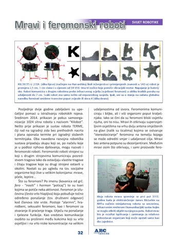 Posljednje dvije godine zabilježeni su upečatljivi pomaci u istraživanju robotskih rojeva. Sredinom 2014. prikazan je pokus samoorganizacije 1024 sitna robota s nazivom “Kilobot”. Nešto prije prikazan je sustav robota TERME, čiji rad na izgradnji zida bez prethodnih nacrta i plana oponaša termite pri izgradnji složenih termitnjaka. Oba navedena razvojna robotička sustava pripadaju skupu koji se, po načelu koje je u podlozi njihova djelovanja, mogu nazvati i feromonski roboti. Feromonski roboti strojevi su koji s drugim strojevima komuniciraju posredstvom tragova tako da ostavljaju vlastite tragove i čitaju tragove koje su drugi strojevi ostavili u okolini. Nastali su po ugledu na tzv. socijalne organizme koji žive u velikim kolonijama: mrave, pčele, leptire... Što su feromoni? Po imenu (kovanica od grč. fero - “nositi” i hormon “poticaj”) to su tvari kojima se potiče neka aktivnost. Feromon je izlučevina (često vrlo hlapljiva) koja pobuđuje točno određeno ponašanje (tzv. društveni odgovor) kod članova iste vrste. Postoje “alarmni”, hranidbeni, seksualni feromoni, kao i feromoni za stvaranje ili praćenje traga. Utječu na ponašanje i tjelesne funkcije. Kao sredstvo komunikacije osobito su prošireni među kukcima koji su vrlo osjetljivi i na vrlo niske koncentracije na velikim