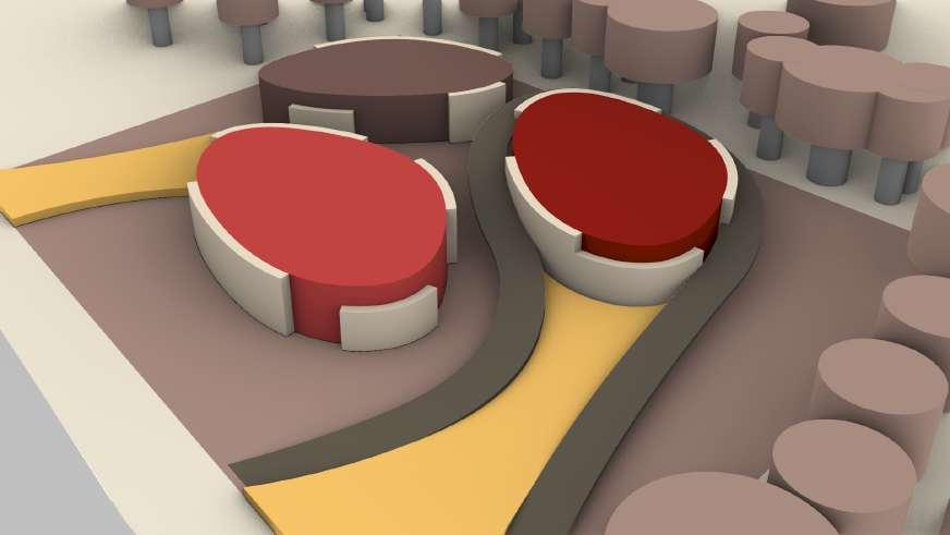 Curving the main masses to allow for a more rounded unified structure, curving the spine in the middle allows for it to bend towards the existing Park's roads