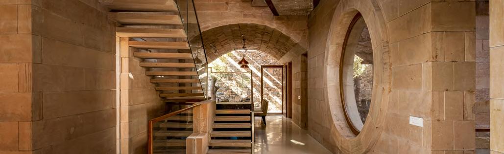 Large front and rear-facing glazing are shaded by deep overhangs and operable, hand-cut stone screens to modulate light, privacy, and views.