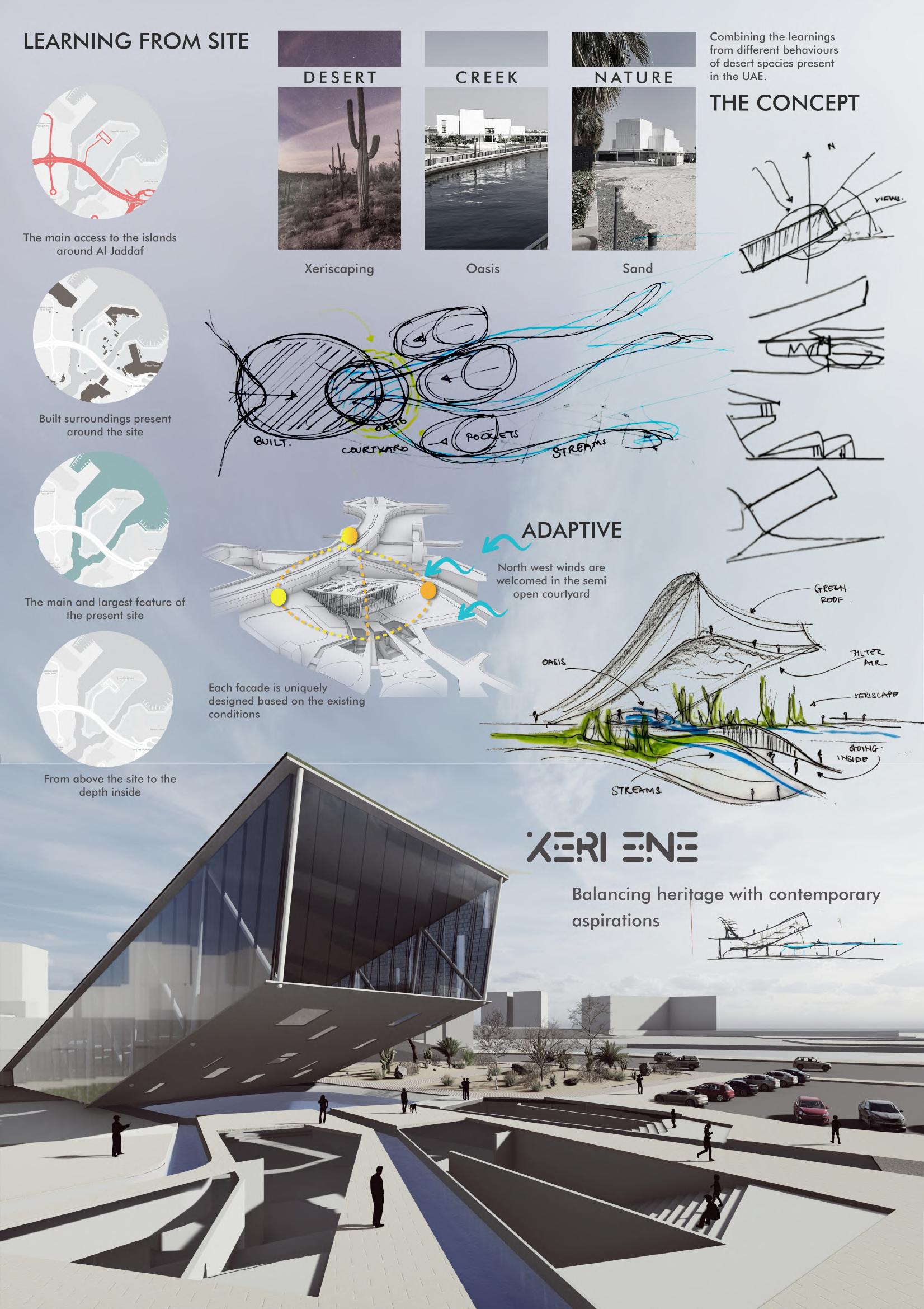 Xeri-Ene combines the subtle aspects of Xeri-Scapes with water-bodies to form a space that helps raise the island’s character with its distinct stance, The slanted main structure has only been repeated once before and was inspired by the engineering feat that the Saudi Pavilion had achieved during the EXPO 2020, heavily calculated engineering measures were taken in to actually make the building feasible.