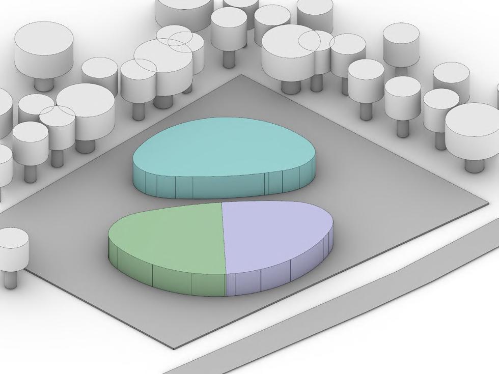 Two basic forms marked as the Cafe and the Terrarium are places on the site respectively according to area standards.