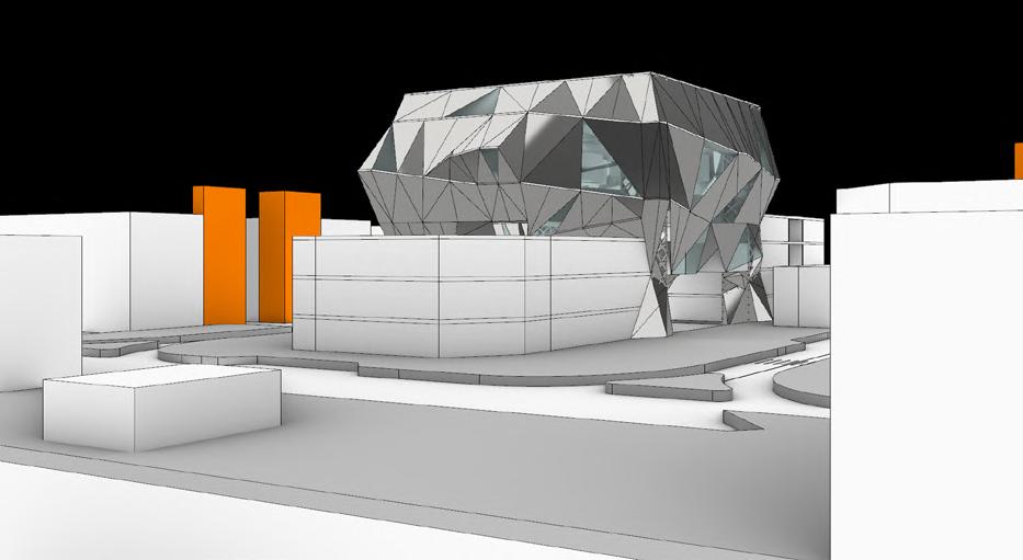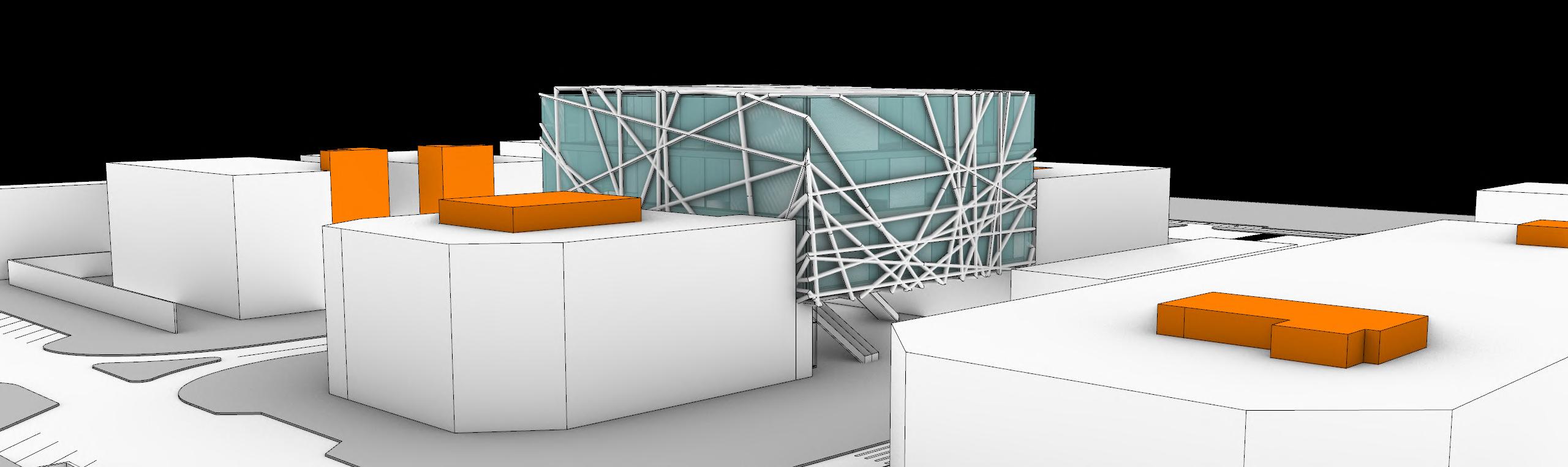 The Final 1:200 Model shows us several integral elements of the Cube like the Main Trusses that hold the Cube upright on either side The Kinetic Facade when completely open and the 3 held up platforms.