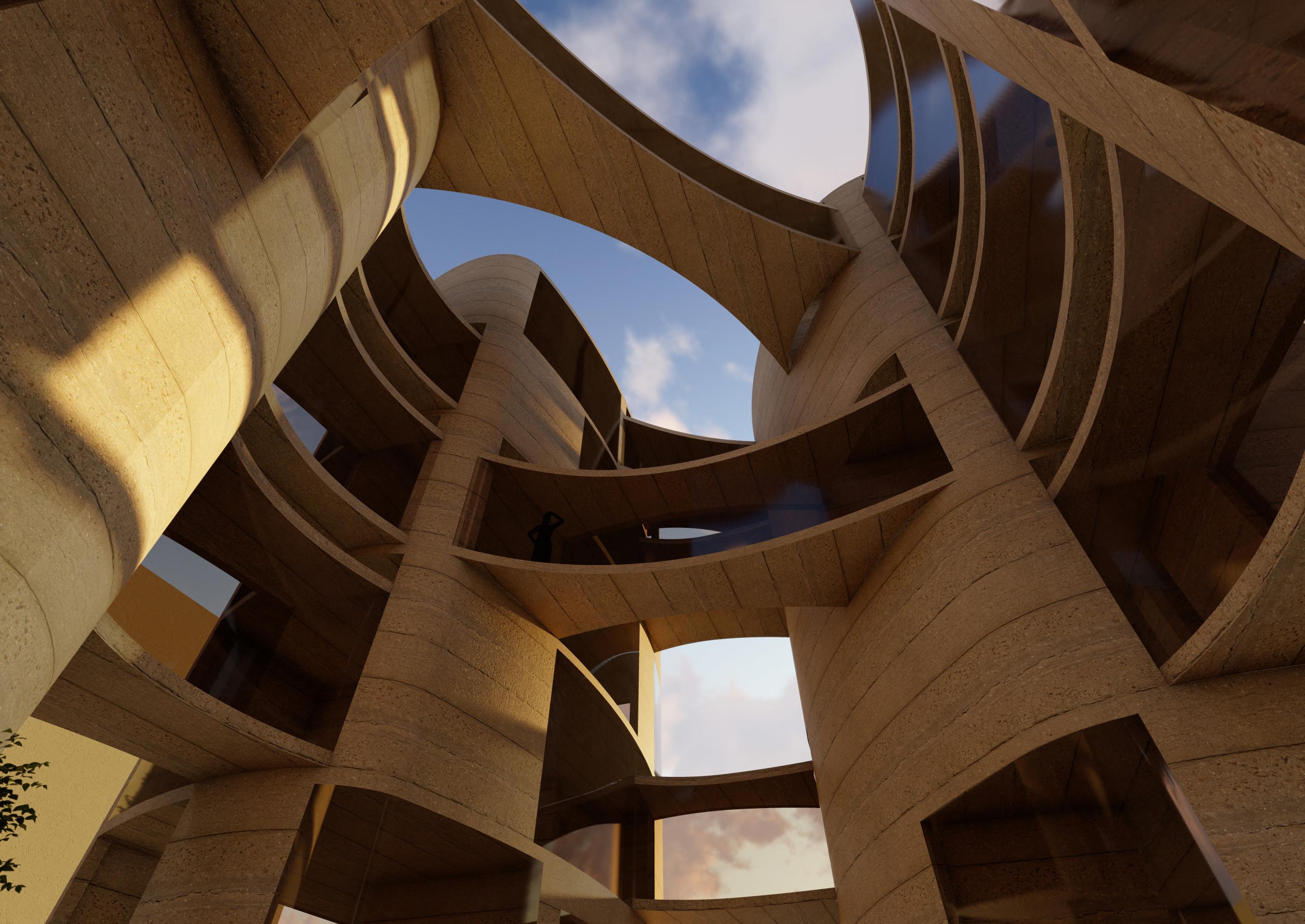 A perspective view of the walk-able ramps that span between floors
