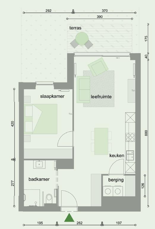 o 37 assistentiewoningen met alle comfort. Alle flats hebben een terras. De bruto oppervlakte varieert tussen 60 en 94m², inclusief terras.