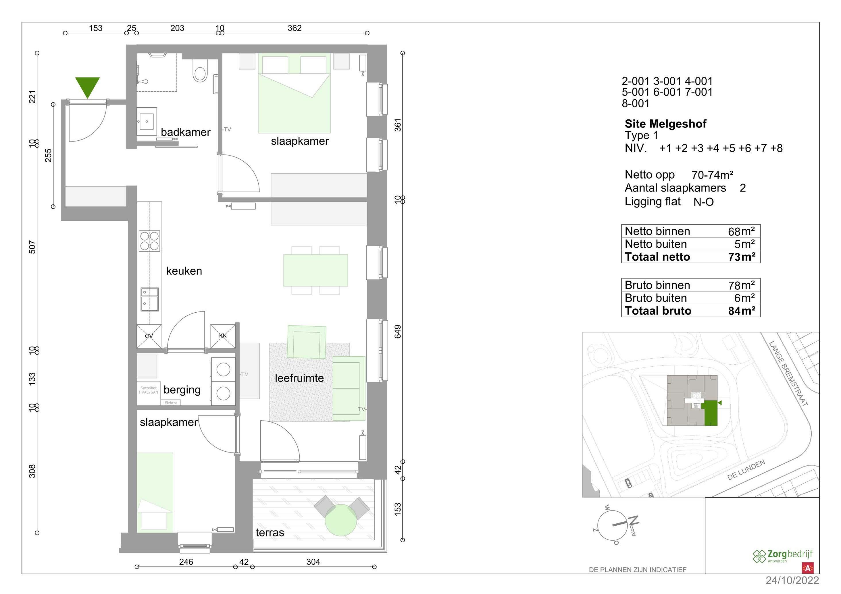 netto 60-69 m² 1 slaapkamer Ligging flat: zuid georiënteerd