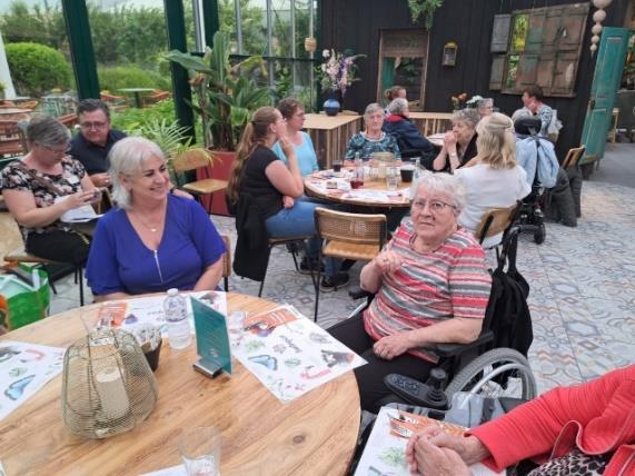 In de middag stond er een lekkere traktatie voor ons klaar: verse patat met een snack naar keuze. Dat ging er goed in na al dat rondwandelen(en rondrijden!) De sfeer was ontspannen en iedereen genoot zichtbaar. Daarna nog een rondje door het park of even lekker shoppen in de rijk gevulde winkel. Om 15:00 uur kwamen we weer samen in het restaurant voor een kopje koffie en een slagroomgebakje.