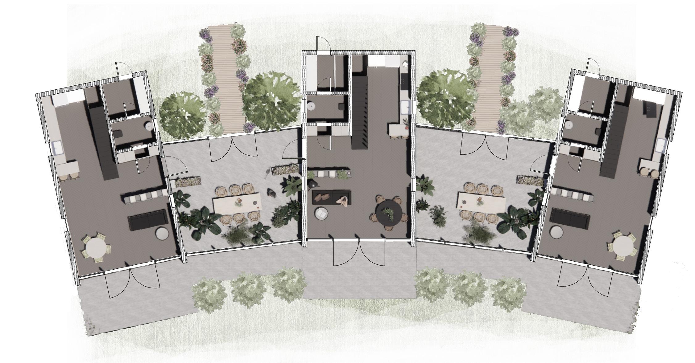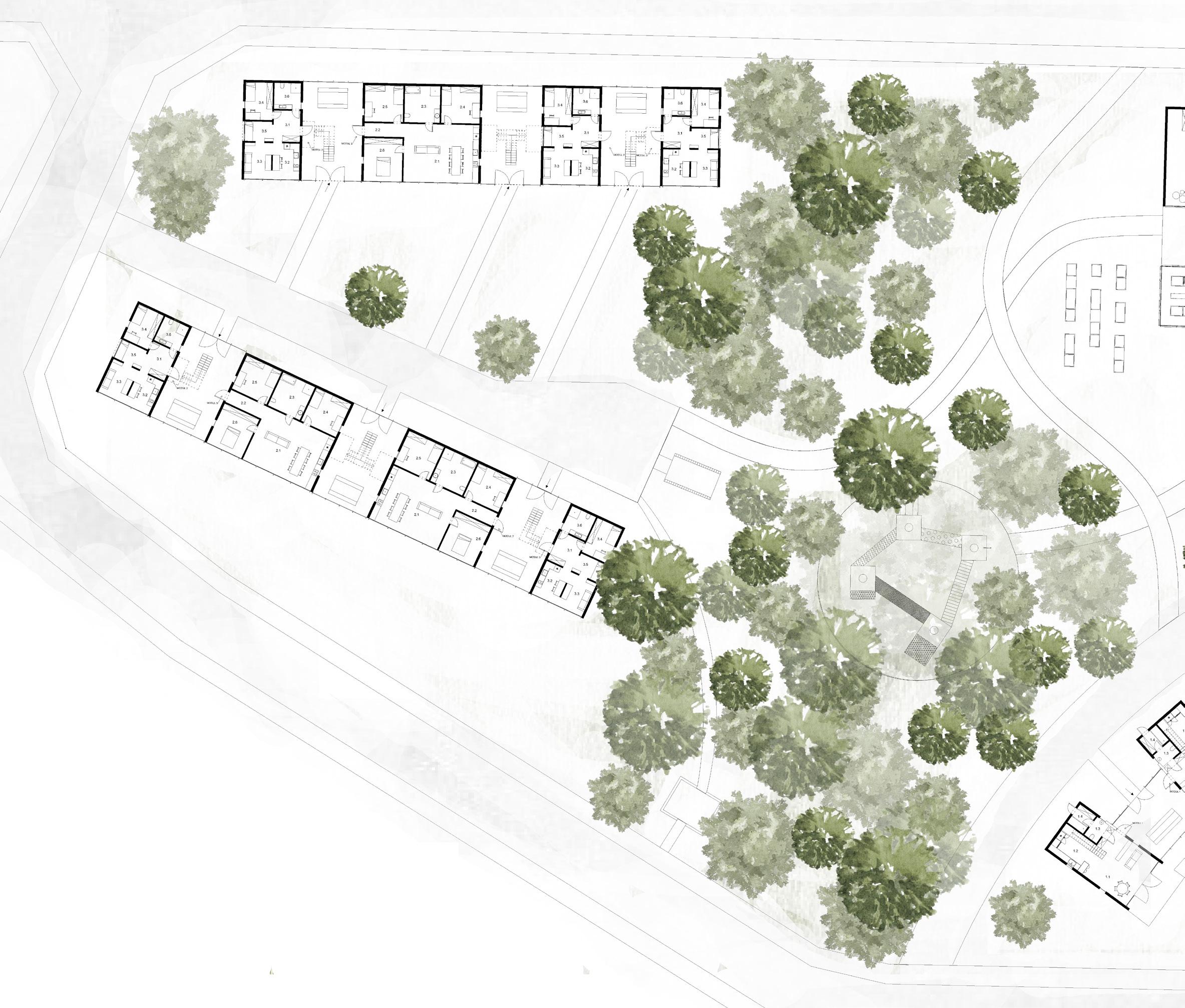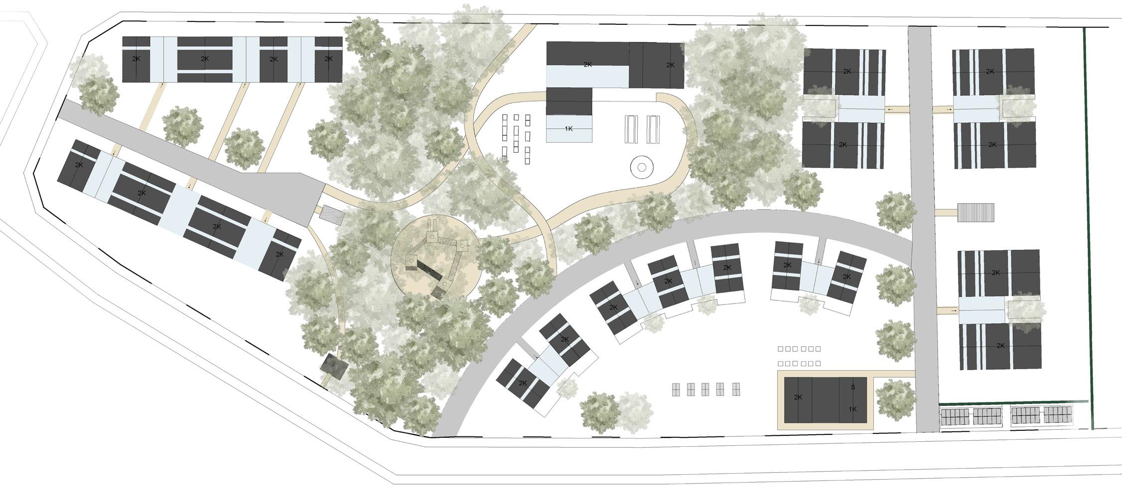 At the heart of the development is the Community House, the central hub of social interaction. It accommodates a library, shared laundry facilities, and recreational areas, while the surrounding open spaces are designed for meetings, relaxation, and children’s play.