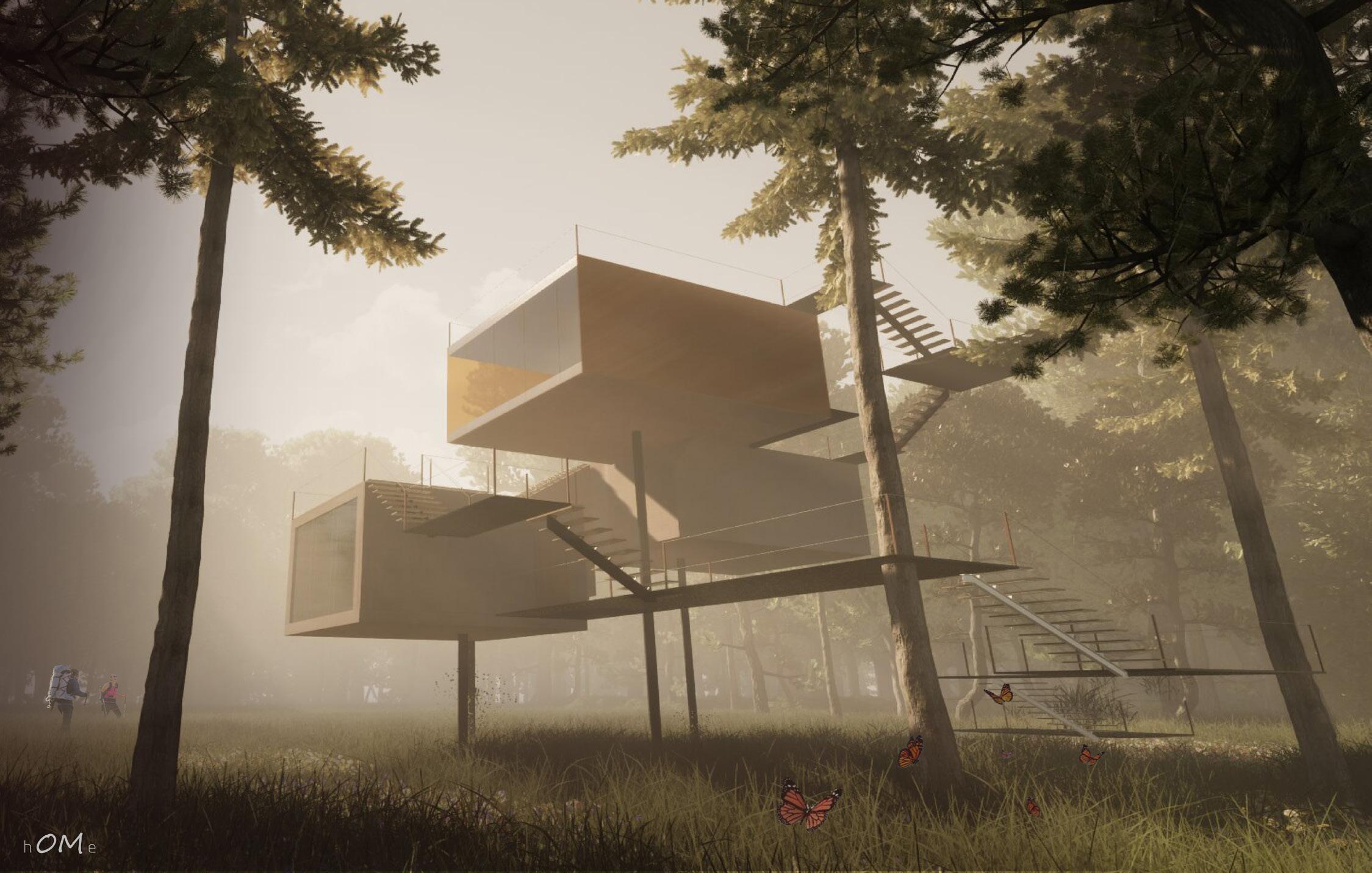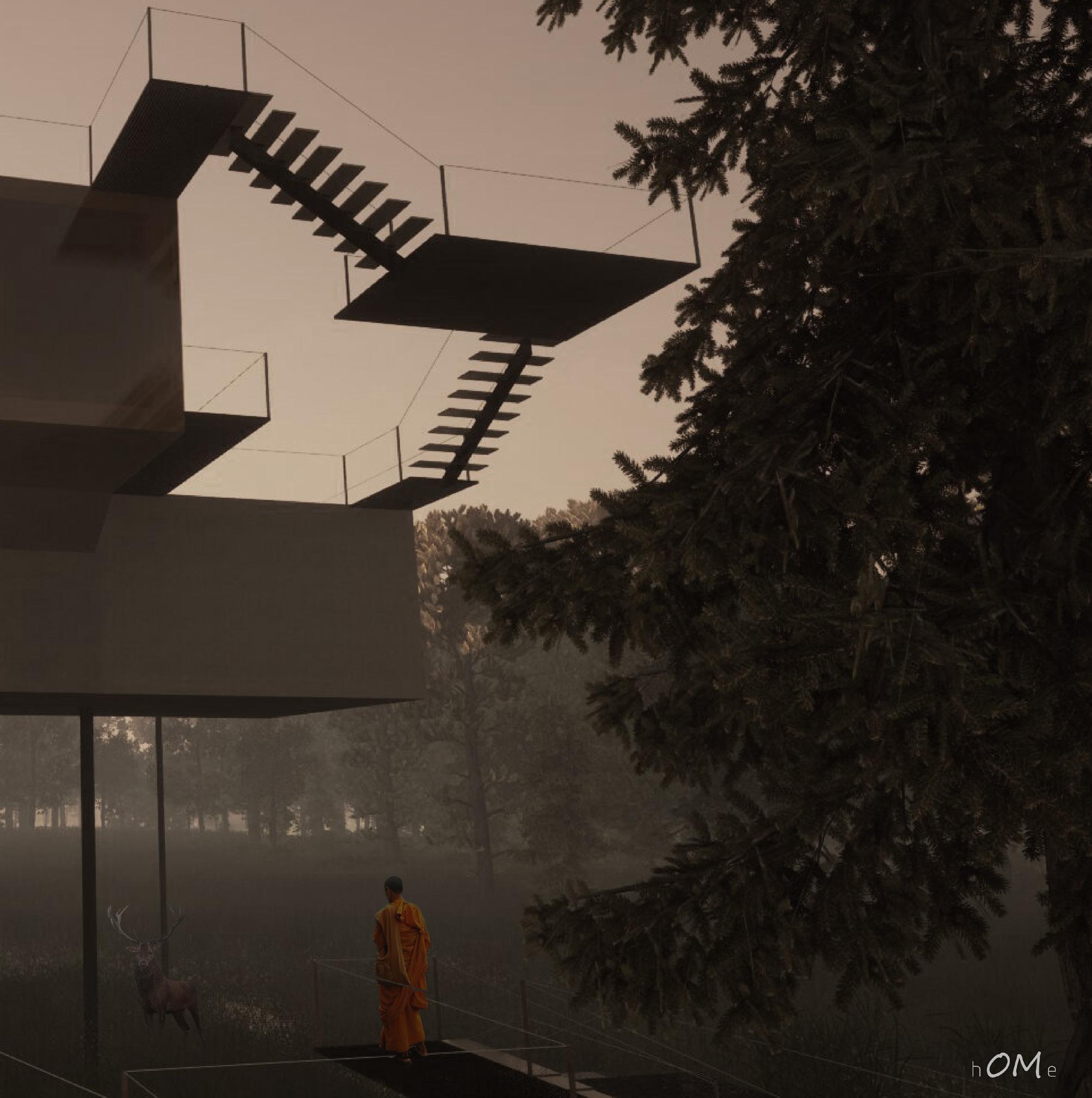 The project “hOMe” originated as the idea of creating a place where spiritual and material realms unite creating a harmony between the inside and the outside. Just like the concept’s name is a combination of the worlds “home” with traditional mantra “om”. The building is designed to let the visitors seek unique experiences while still having a safe space to rest.