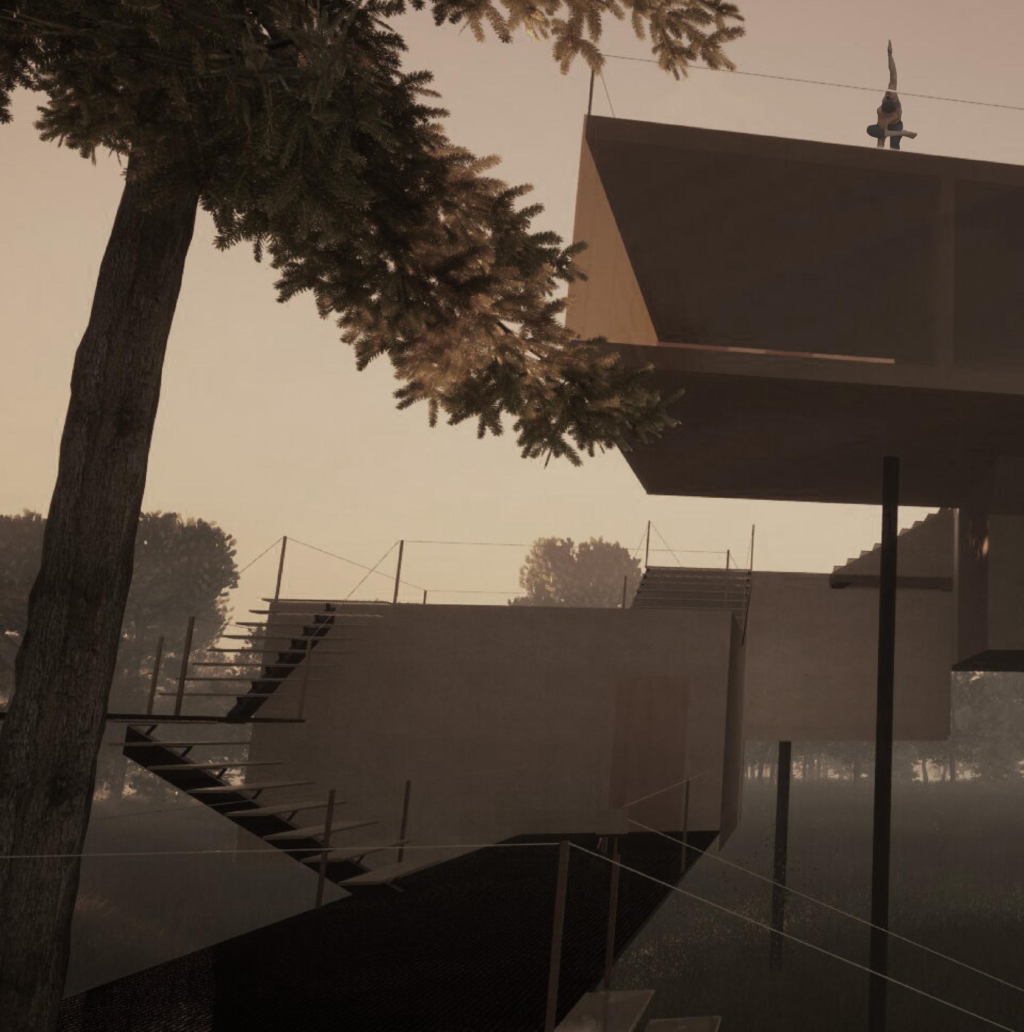 The concept consists of four cuboids lifted several meters above the ground, bringing the whole building closer to the crowns of the trees, as well as enabling more sunrays to light up the interiors. Access to the house is provided by numerous bridges and series of stairs leading to not only insides, but also rooftops of the cuboids. The topmost room is the yoga space, shielded from the rain, wind and other elements by wood and glass, at the same time providing panoramic view on three sides of the world. In order to access rooms located below, there is a system of staircases located entirely inside the building, connecting the yoga space, a kitchen and two en-suite bedrooms.