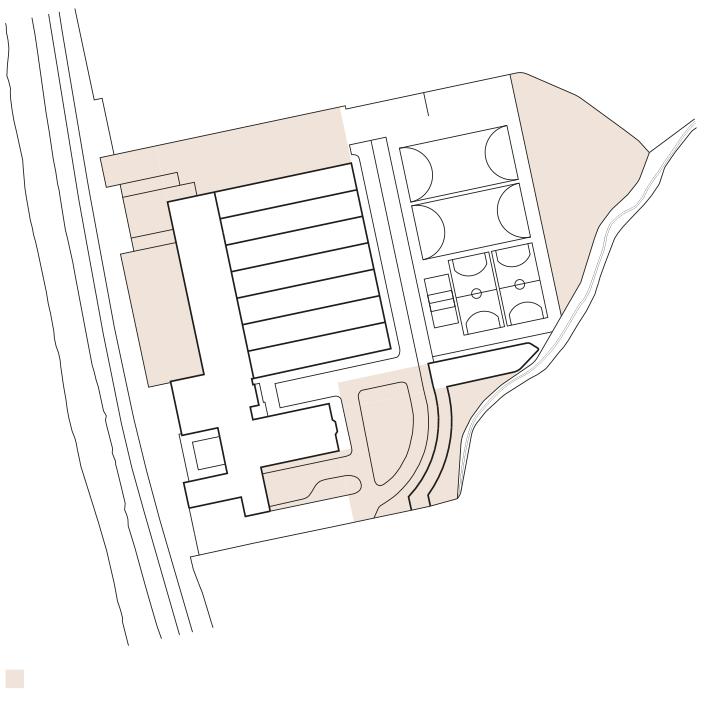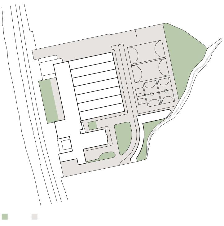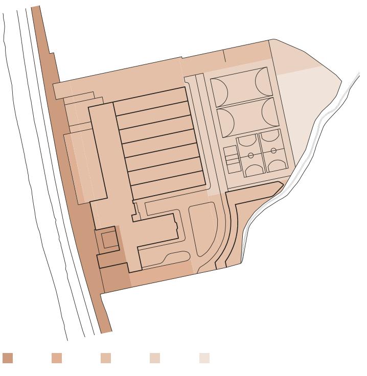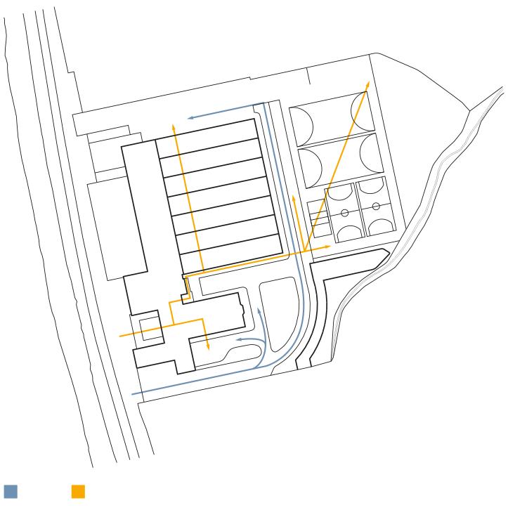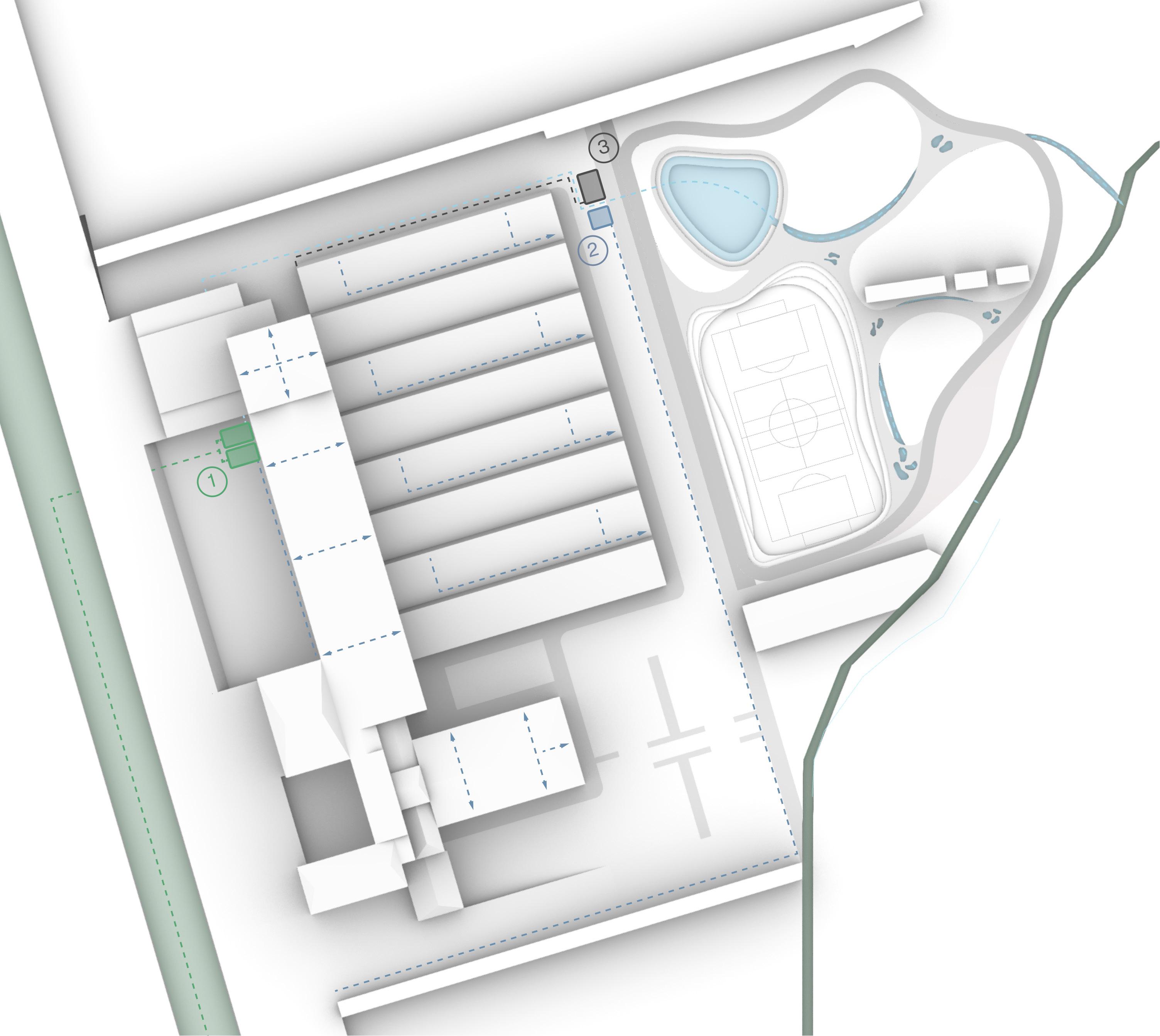 After the stairs reach the entrance to the building, the split into two paths: the interior one and the exterior one. The first of the two is what joins the cuboids in a one building, creating a safe and always available passage connecting all od the rooms and functions. The exterior path ascends on the roofs, making them accessible. It splits and rejoins, reaching far over the meadow and closer the forest and the sea. The paths are united again in the uppermost part of the building, near the multifunctional yoga space. This dual system allows for both sheltered and open movement through the building, enhancing spatial experience and accessibility.