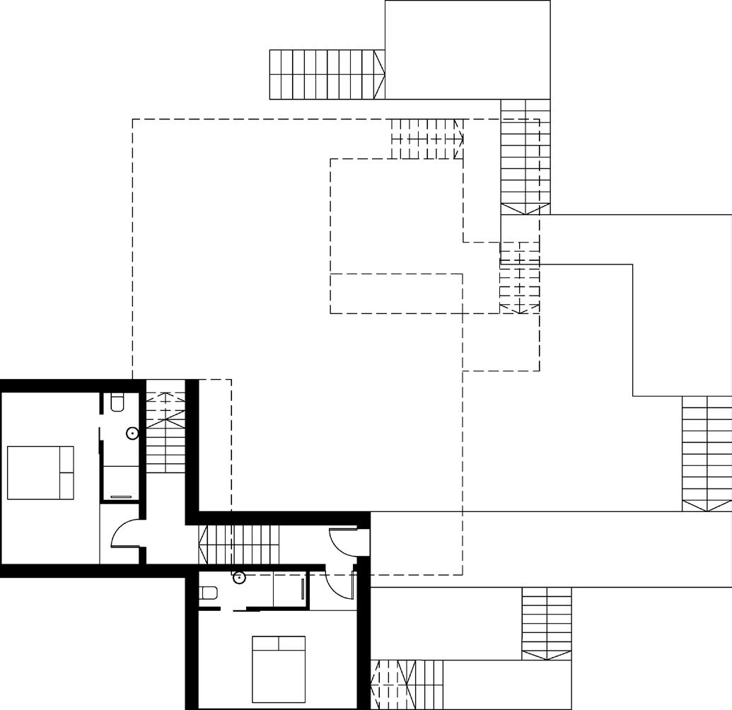 The two remaining cuboids contain bedrooms which are located respectively half of the level and a full level below the kitchen. Both of them include a double bed and a panoramic window. As en-suite bedrooms include a small bathroom as well. Design of the bedrooms corresponds with the overall light structure of the building by including a simple system of clothes hangers attached to the ceiling instead of standing on the floor. The tap over the freestanding sink in a bathroom is also attached to the ceiling.