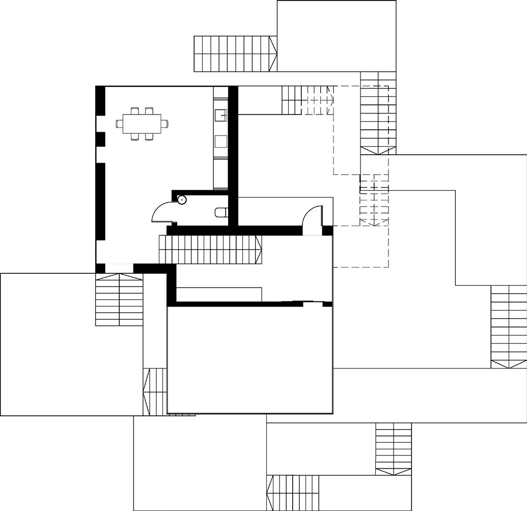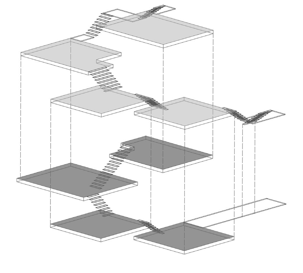 The diagram illustrates the vertical circulation system of the building, highlighting the two parallel routes- the interior staircase, enclosed within the building volume, provides direct access between all levels and the exterior staircase and bridges wrap around the structure, creating an open pathway that connects terraces and intermediate landings across multiple levels.