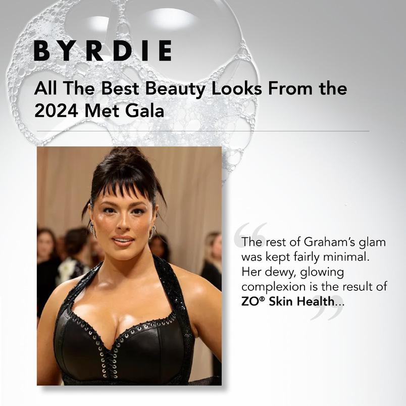 ZO® Skin Health is featured by Byrdie as part of “All The Best Beauty Looks From the 2024 Met Gala.” The article notes that Ashley Graham’s “glowing complexion is the result of” Exfoliating Cleanser, Exfoliating Polish, Complexion Renewal Pads, Illuminating AOX Serum, and Growth Factor Serum.