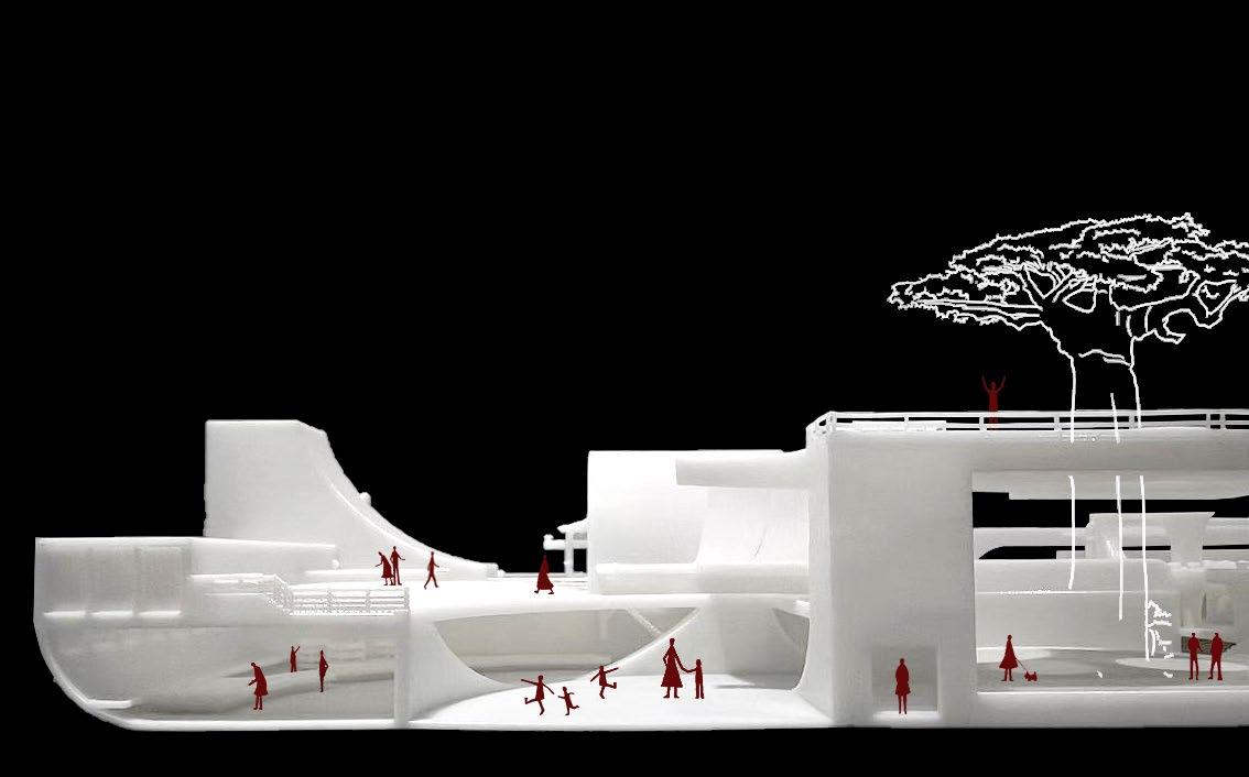 In the rest area, people can have spiritual healing by hugging the baobab tree, having close contact with the baobab tree, and feeling the texture of the tree, surrounded by purified water. In the clear water, the stone slab is engraved with the message of the children who died due to oil pollution, in memory of them.