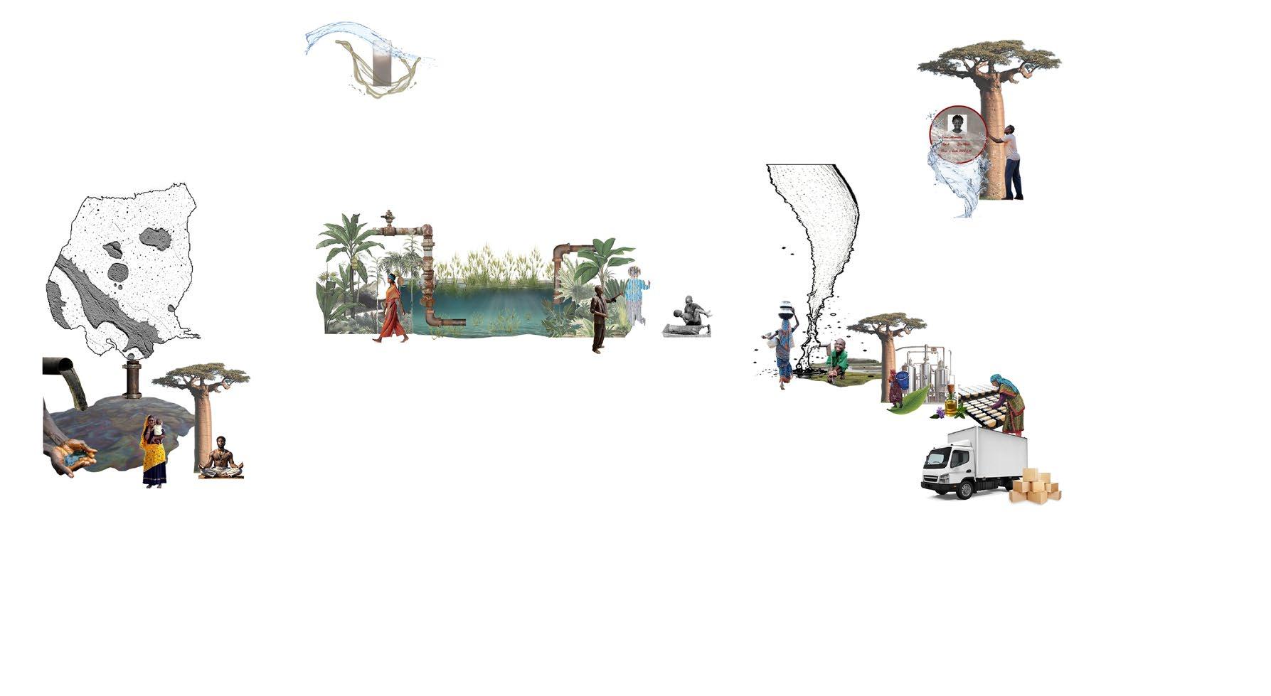 People pick the leaves of the nearby baobab tree, and use the conveyor belt to transfer the leaves from the first floor to the second floor to make plant essential oils and lye, and the prepared plant essential oils and lye are sent through the pipeline to the first floor for making handmade soap. The handmade soap produced by people will be transported to various places for sale. The whole process can not only cure people's anxiety and fear through diy handmade, but also provide new employment and bring new income to those who are involved in the business.