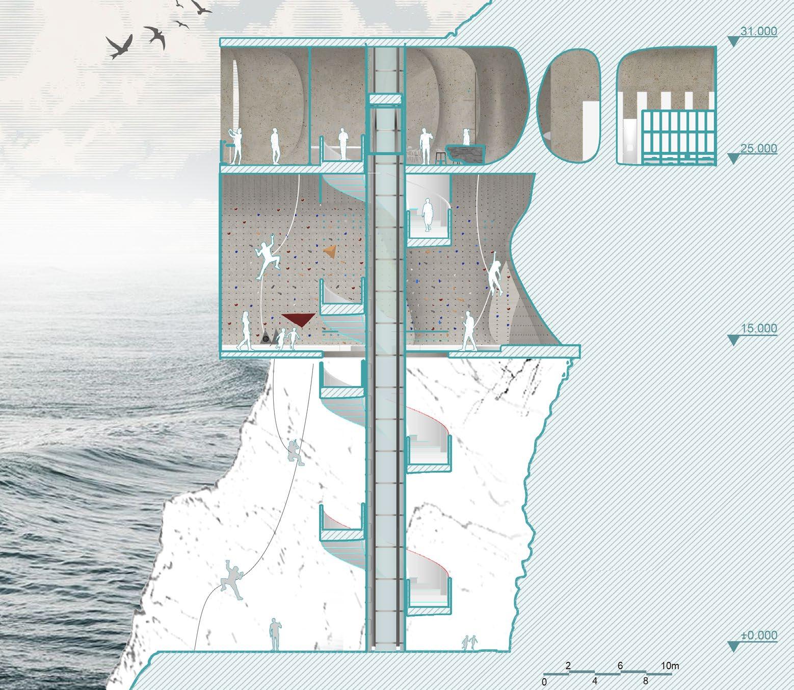 With the development of today's society, more and more people like rock climbing, and the number of rock climbing gyms is increasing. After research, most of these rock climbing gyms are used in commercial spaces such as shopping malls, followed by fitness sports. In general, most rock climbing gyms are indoors. However, with the continuous improvement of people’s rock climbing skills, indoor rock climbing has sometimes been Unable to satisfy their desire for exploration and challenge, people slowly turned their attention to the outdoors. However, outdoor rock climbing is very common abroad, but it is rare or even non-existent in China. Therefore, the project is located in Weihai, Shandong Between a cliff on Jiming Island, it not only meets people's needs for indoor rock climbing, but also provides space for outdoor rock climbing.