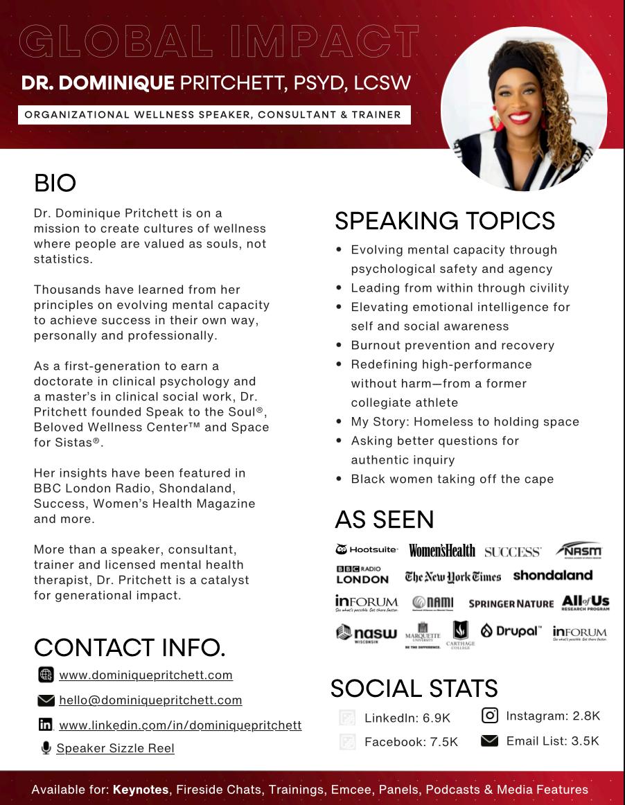Dr. Dominique Pritchett, PSYD, LCSW, is a nationally recognized clinical psychologist, social worker, author, speaker, and wellness catalyst on a mission to create cultures of wellness where people are valuedassouls notstatistics.